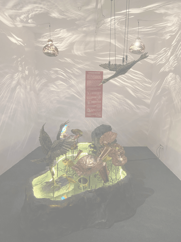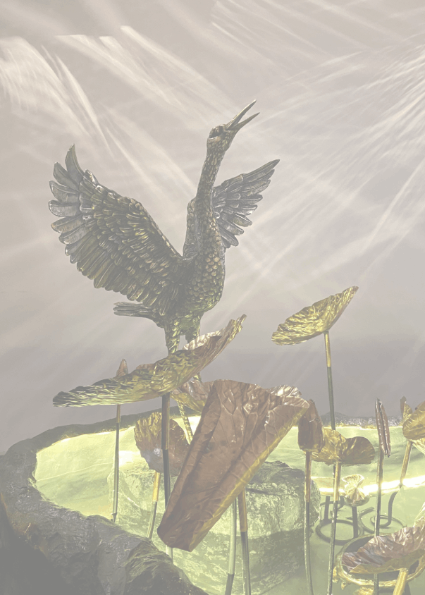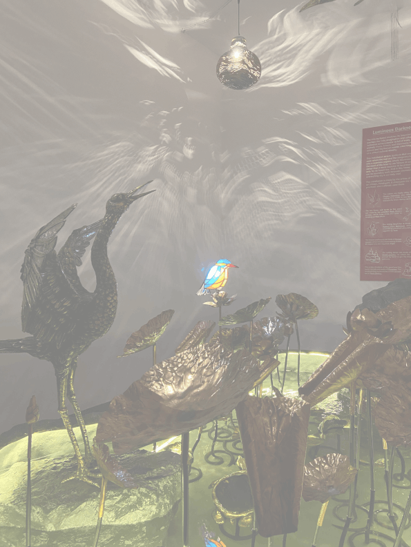Luminous Darkness- This installation was a commissioned piece for the Serendipity Arts Festival in Goa (December 2024). It is an artificial lotus pond, showcasing all the various techniques that we work in- the pond is of fibreglass, the lotuses and leaves are beaten copper sheets, the fishes and tortoise in the water are Rock Dhokra, the big cranes made in brass using the lost wax casting process, the small lit kingfisher is made of stained glass, and the ceiling lamps casting magical light and shadow patterns on the walls are Tumba lamps. The installation also includes a running water cascade (made of fibreglass).