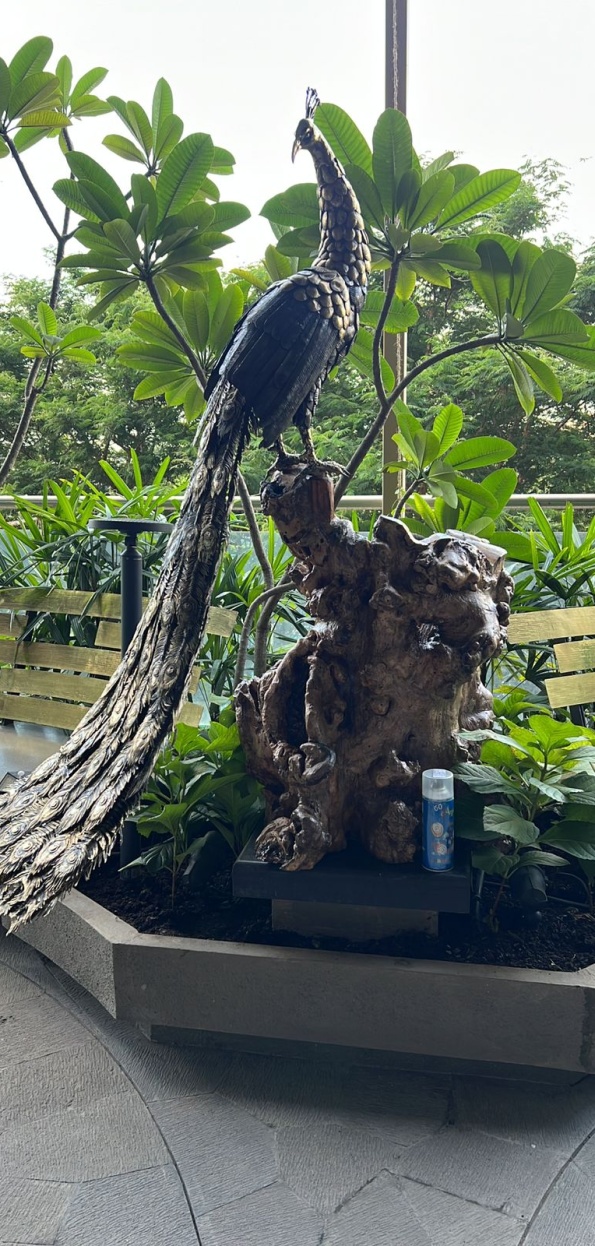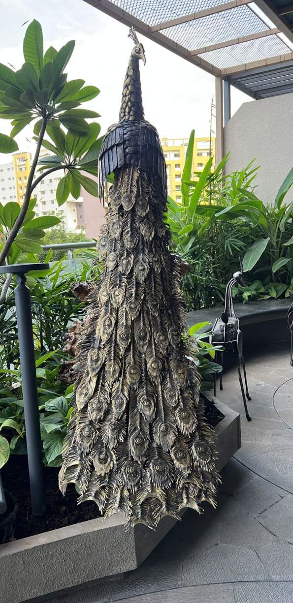 Peacock Sculpture- This life-size peacock sculpture was a commissioned piece made for a client in Pune in 2023. The body and the tail feathers are made in brass using the lost wax casting process, each feather made separately and laboriously attached to the tail. The wings are made of beaten iron sheets.