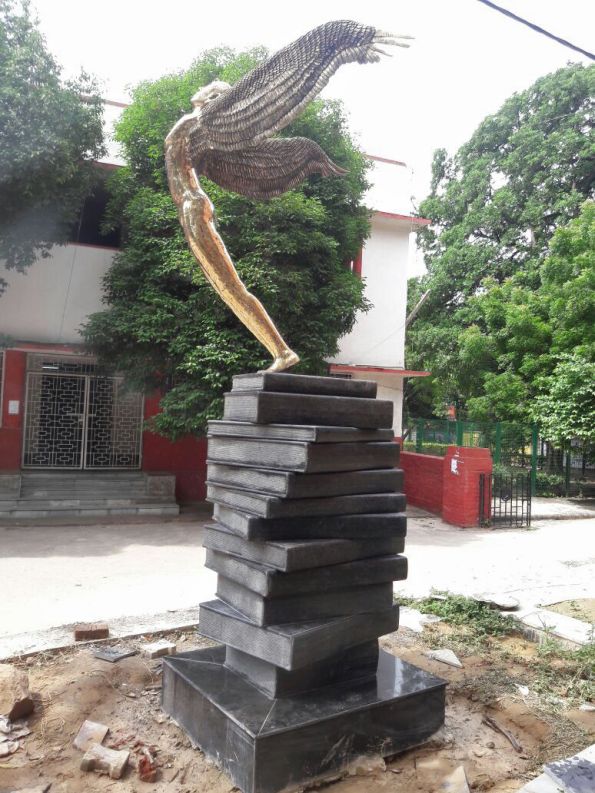Winged Human- This sculpture of a Winged Human taking off from a pile of books, made by us in 2017, is installed in Hindu College (Delhi). The life-size human is made of brass, so are the wings- they’re made using the lost wax metal casting process. The books are made of stone.