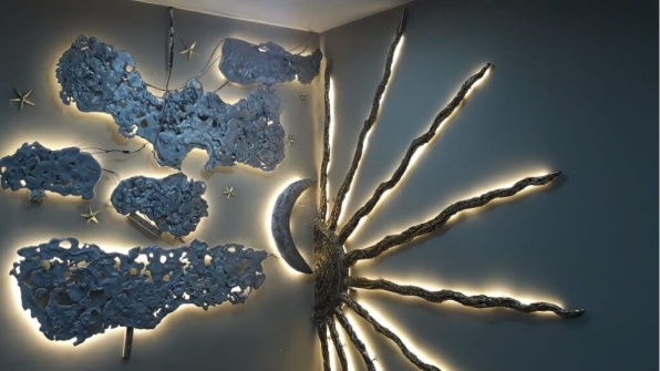 The Sun and the Moon- This wall mural is installed in a business school in Mumbai. The moon is made by casting aluminium, and then clouds are solidified pieces of molten aluminium. The sun is made by organic casting of tree branches in brass. The entire mural is backlit with LED strips. One side is about 6-7 ft in width.