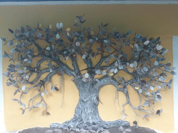 Banyan Tree Mural- This 12 x 7 ft Banyan tree mural was made in 2018, a commissioned piece for St Mary’s School, Pune. The entire tree is cast in brass, with the leaves made by organic casting of actual Banyan leaves. The parrots sitting on the branches are also made of brass.
