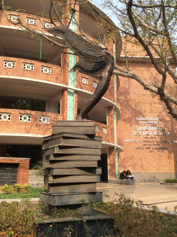 Soaring Human- The Soaring Human, taking off from a pile of books is made in fiberglass. It’s similar to the brass one at Hindu College (see above). But instead of wings there are branches, and even the books are made of fiberglass. This is installed at the entrance of Devrai.