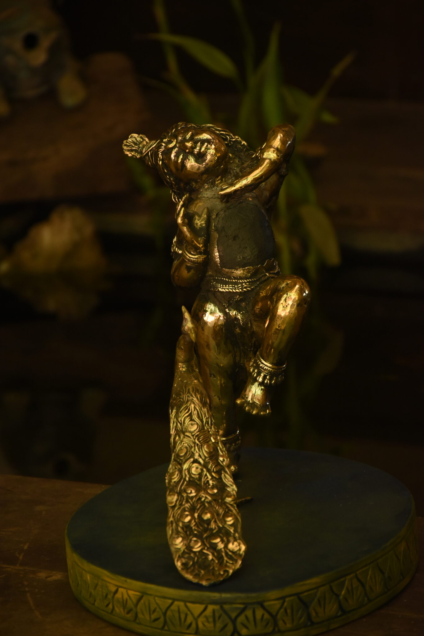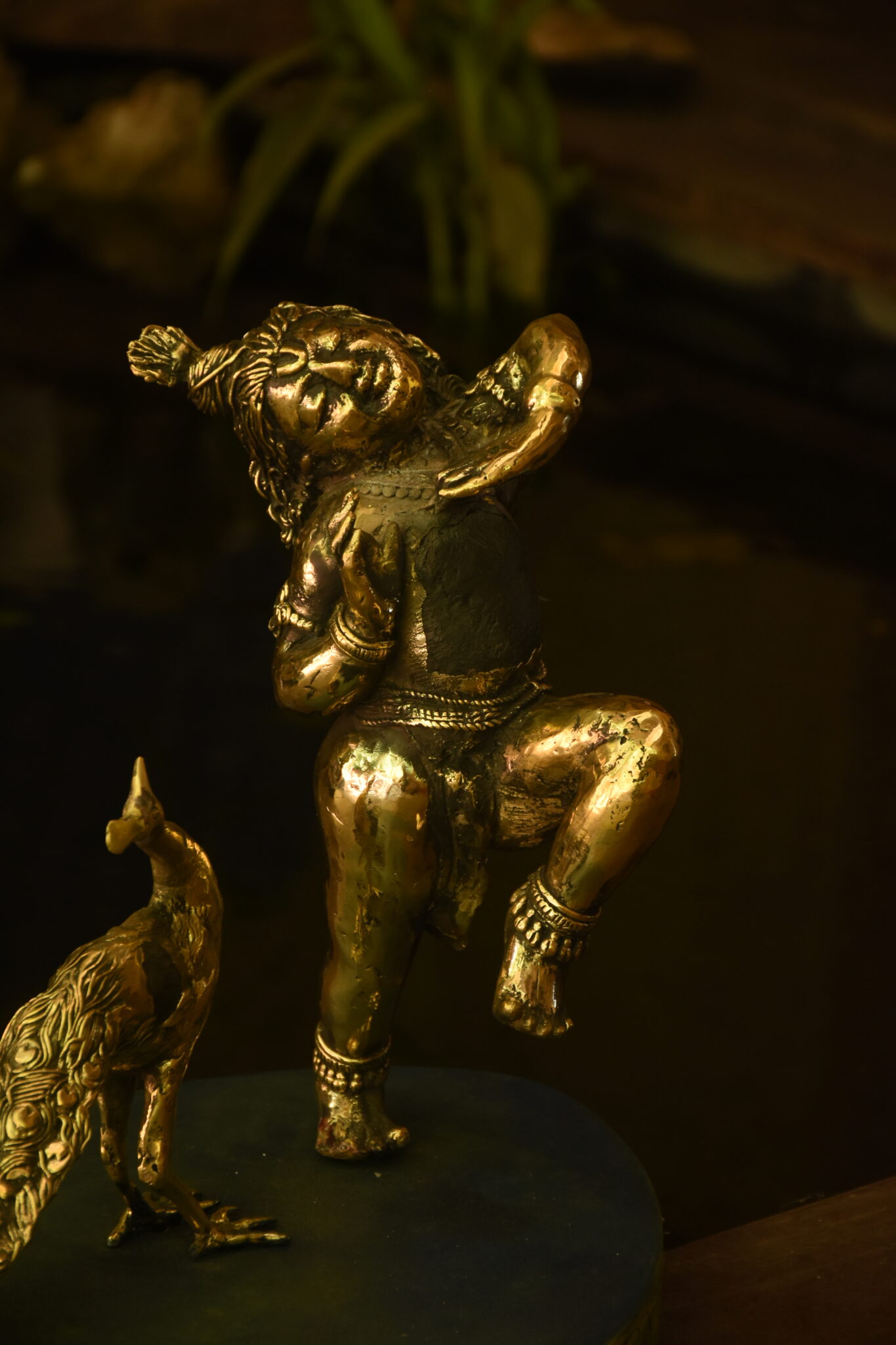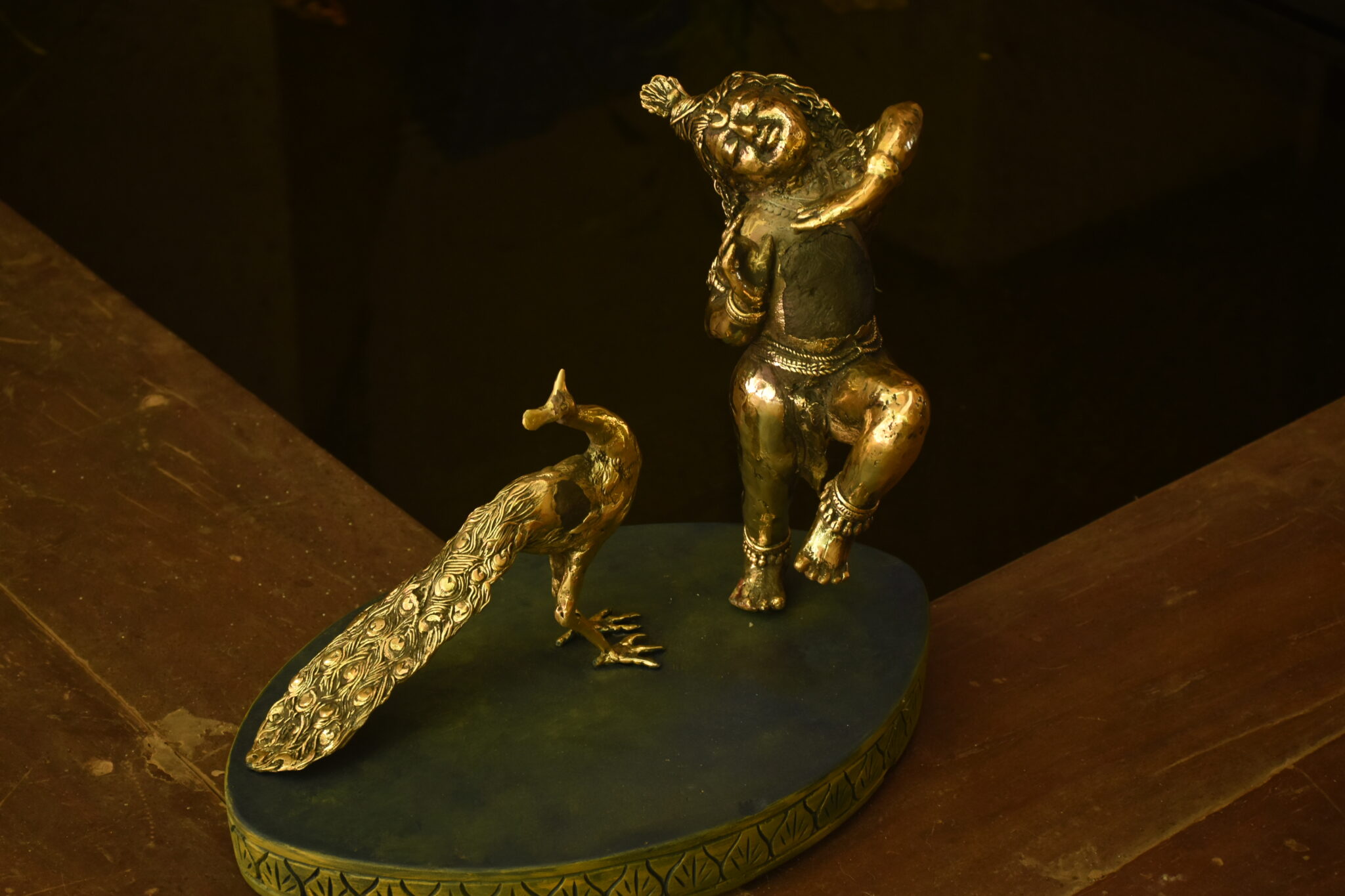 Here Krishna and the peacock are both made in Rock Dhokra, standing on a carved wooden base.
