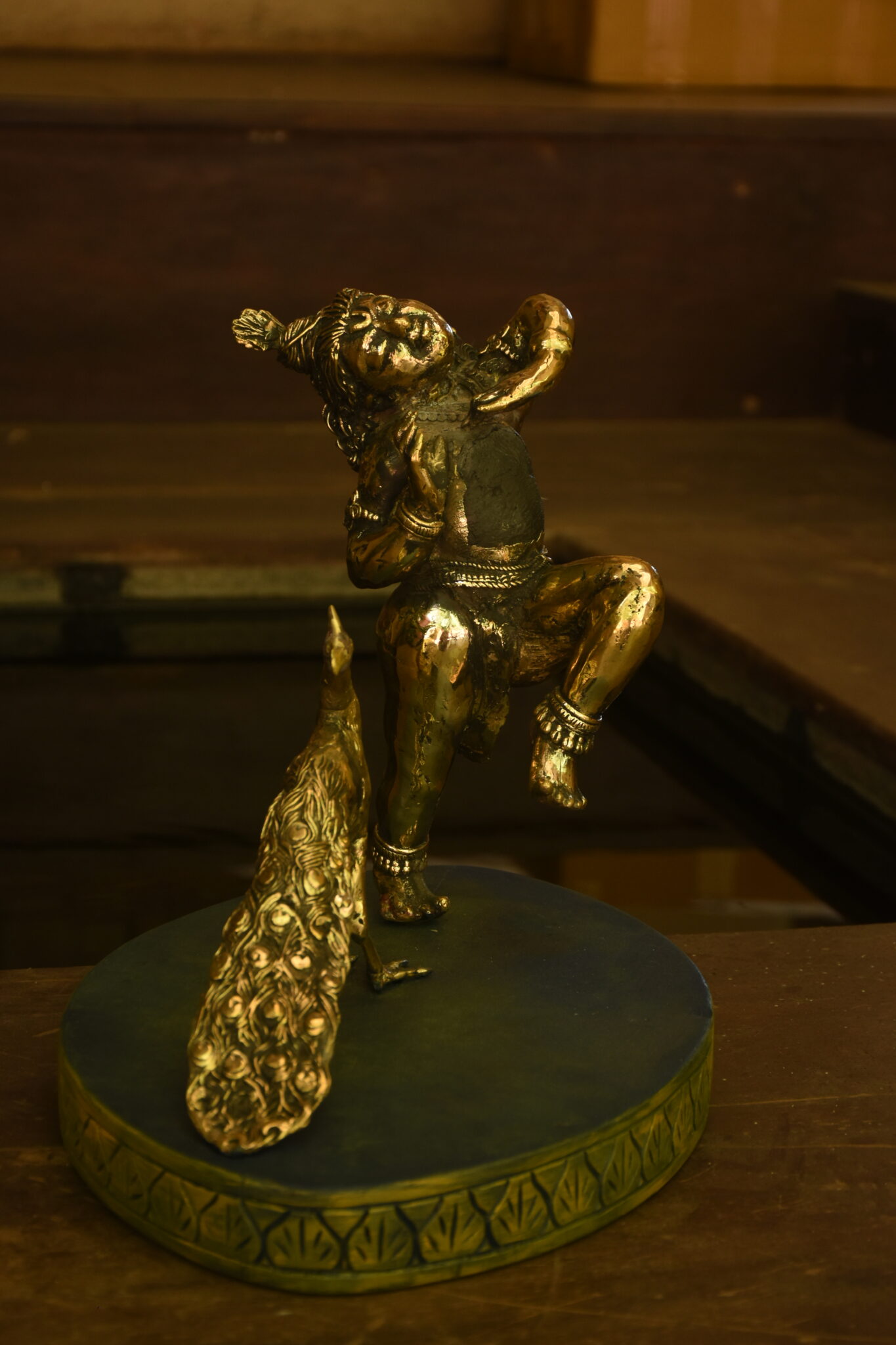 Krishna Leela- for us humans to relate to the divine, sometimes God even takes the form of a playful child. Here, the peacock also joins him in his dance!