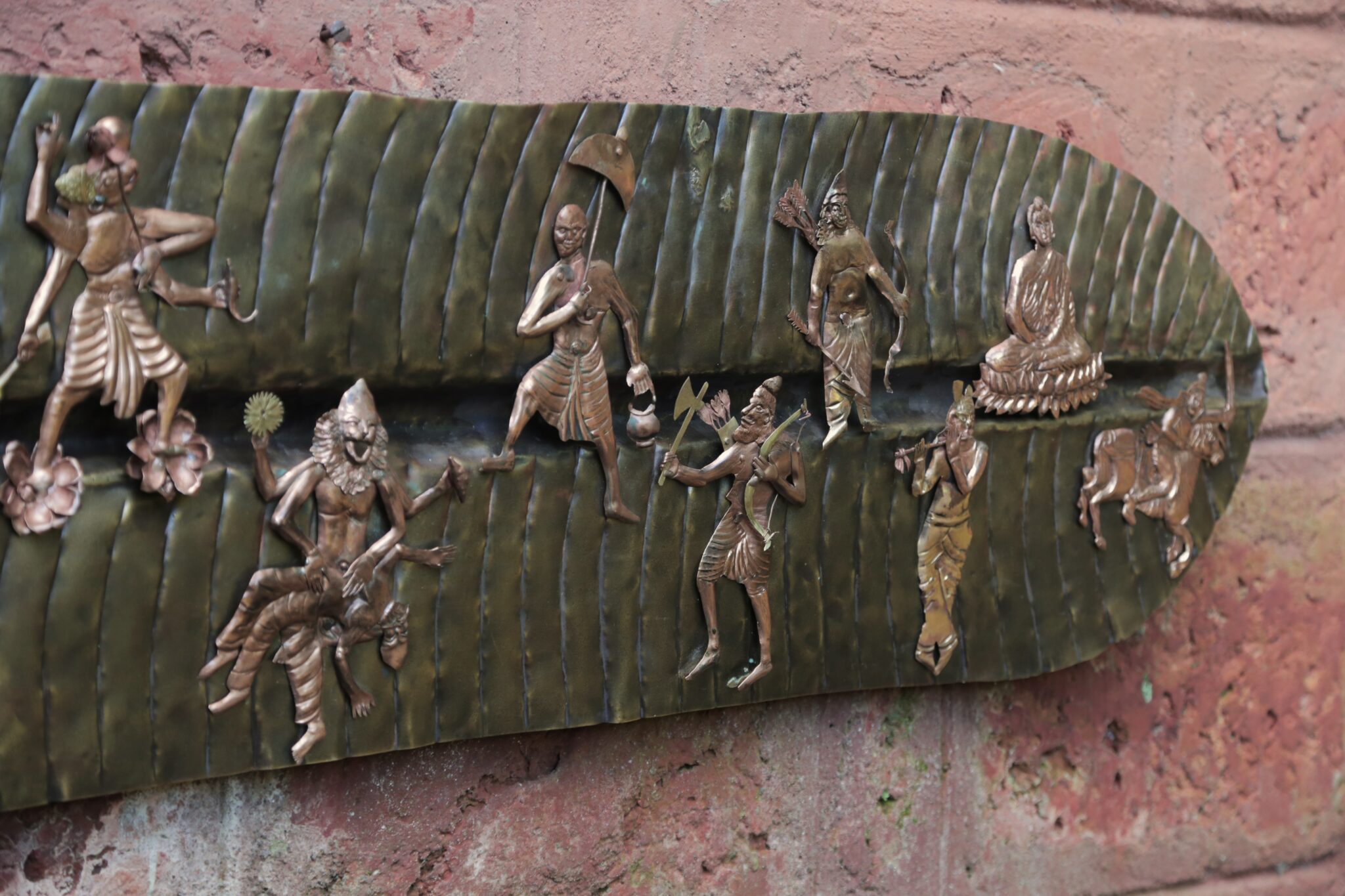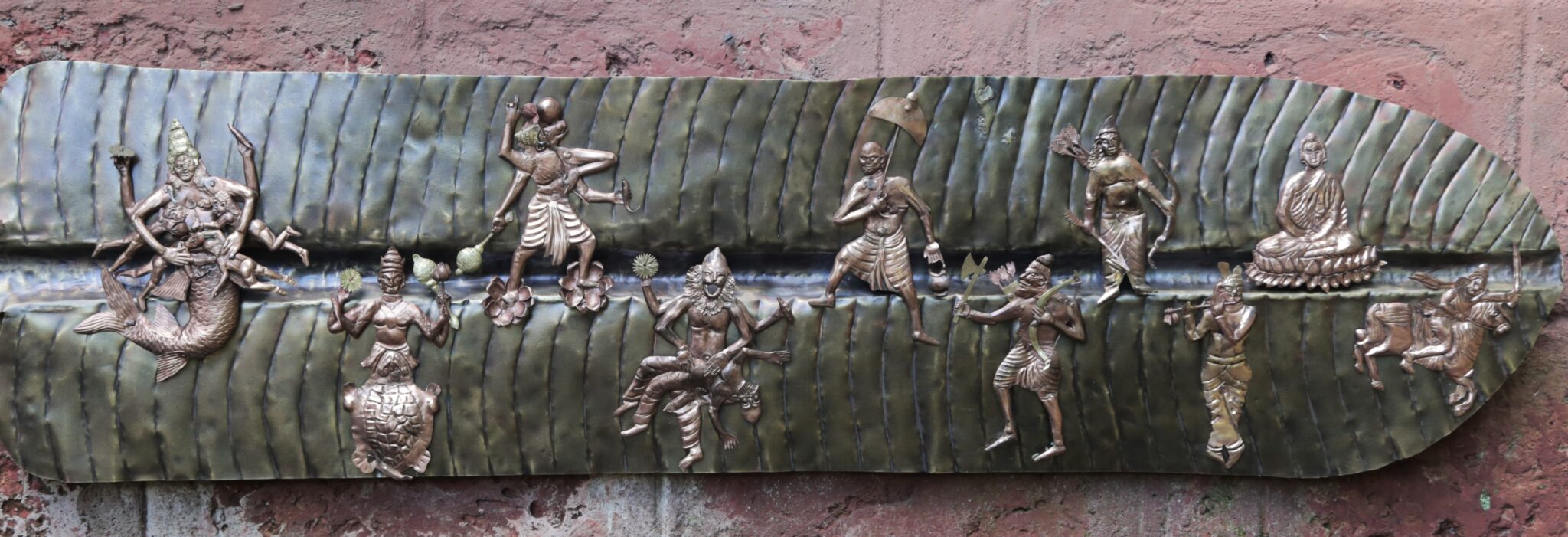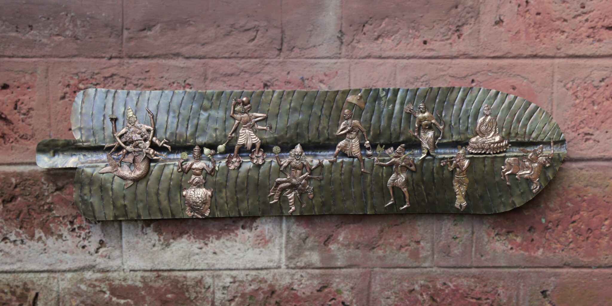 This brass and copper wall mural depicts the Dashavatara through finely detailed forms, each avatar distinct yet harmoniously composed. The Dashavatara are the ten incarnations of Vishnu, taken to restore balance and protect the world whenever it falls into disorder. Each avatar appears in a different form?from aquatic and animal to human and divine?reflecting the needs of the time. The avatars in this piece are- Matsya (fish), Kurma (tortoise), Varaha (boar), Narsimha (man-lion), Vamana (dwarf god), Parshurama (brahmin warrior), Rama, Krishna, Budhha, and Kalki.