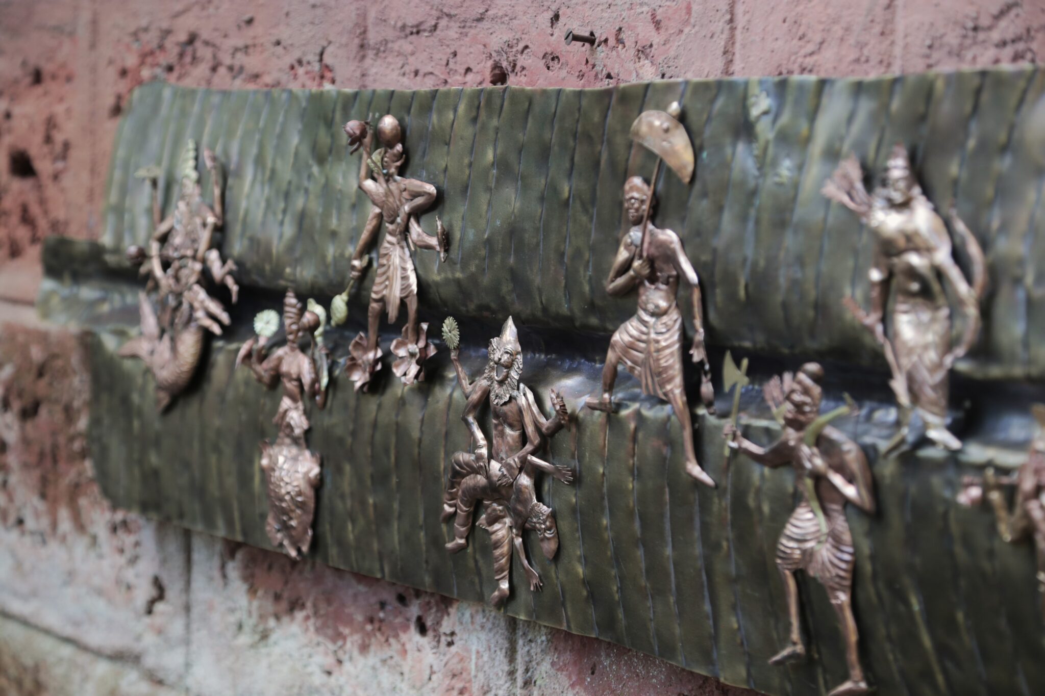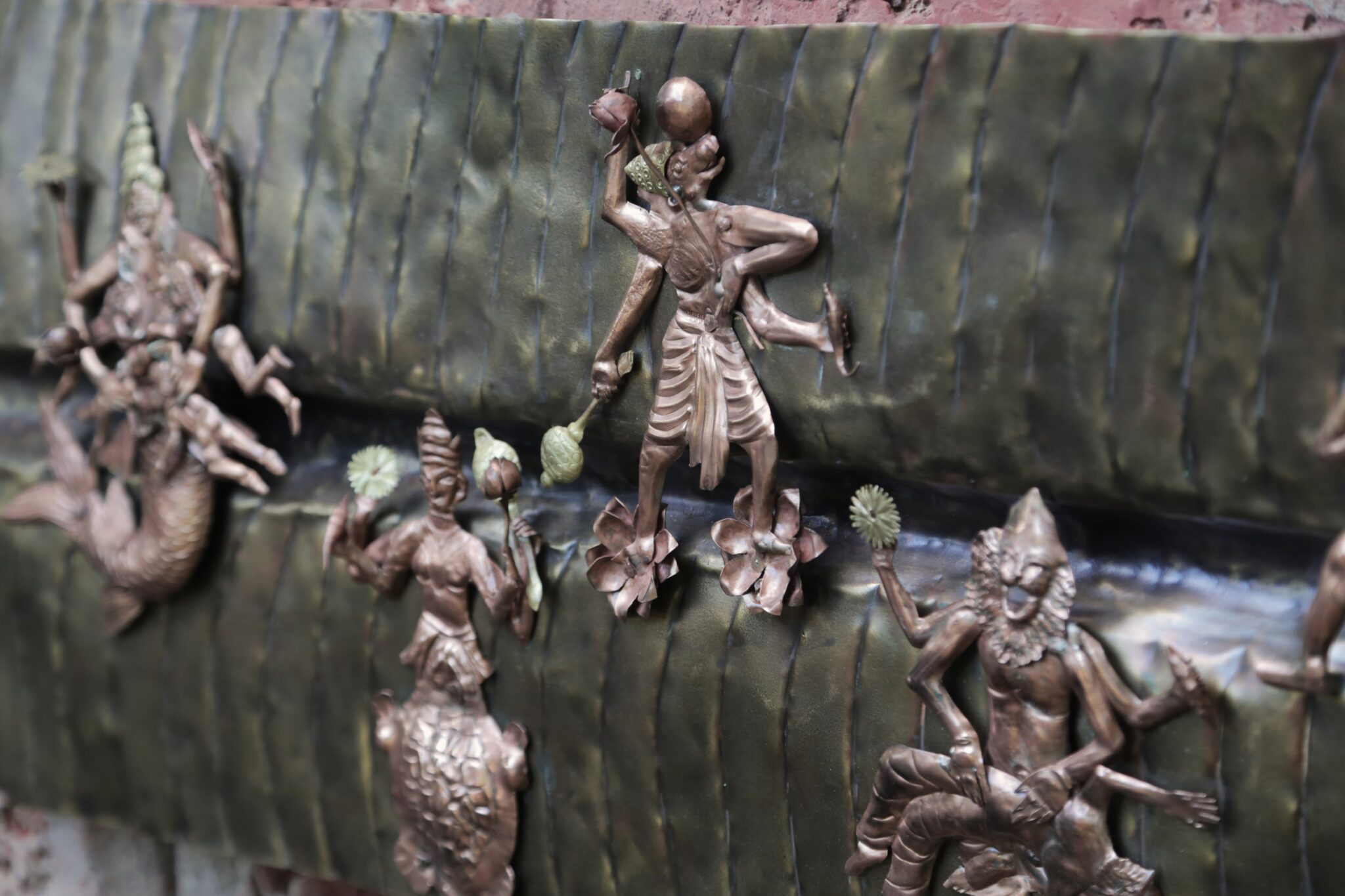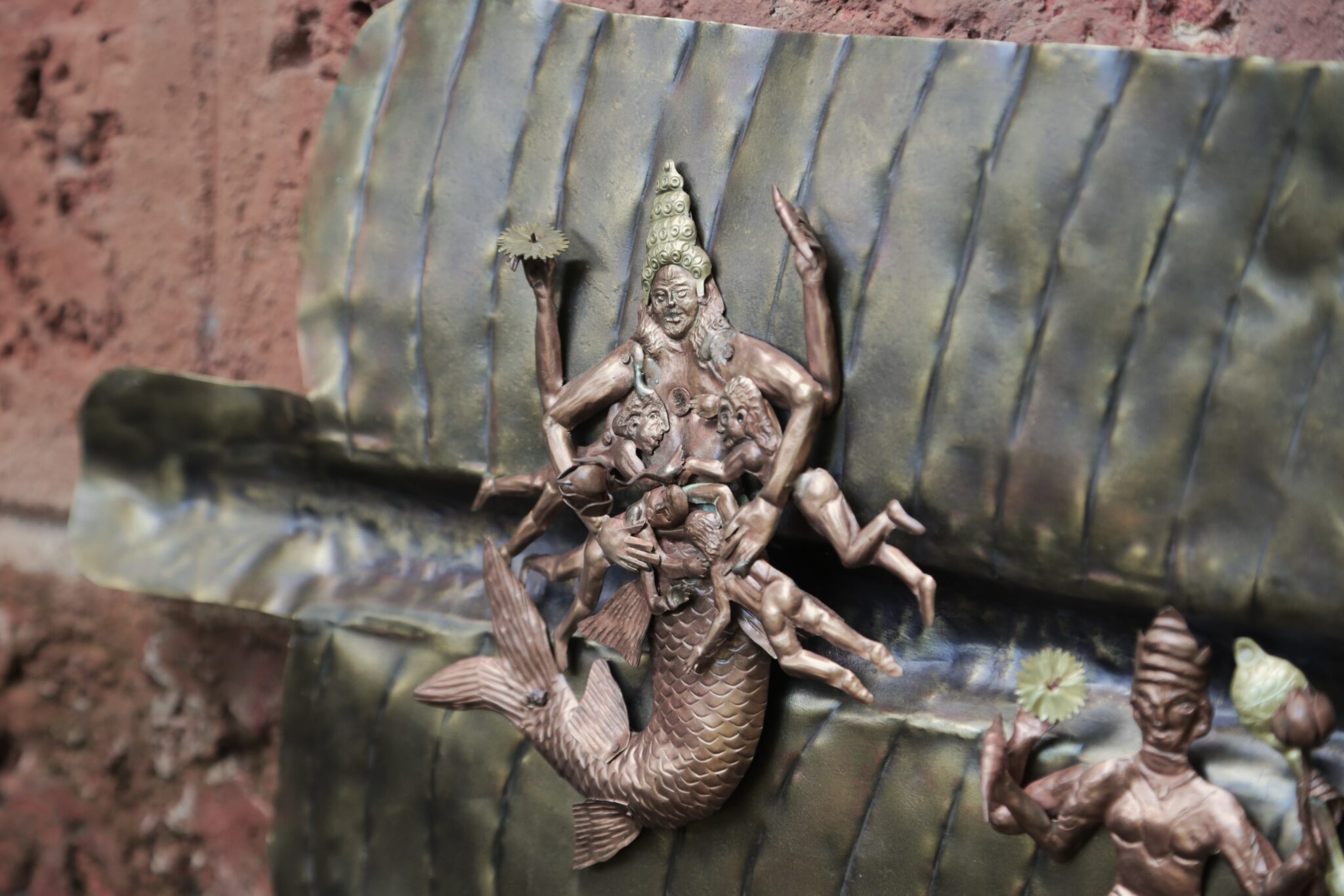 This brass and copper wall mural depicts the Dashavatara through finely detailed forms, each avatar distinct yet harmoniously composed. The Dashavatara are the ten incarnations of Vishnu, taken to restore balance and protect the world whenever it falls into disorder. Each avatar appears in a different form?from aquatic and animal to human and divine?reflecting the needs of the time. The avatars in this piece are- Matsya (fish), Kurma (tortoise), Varaha (boar), Narsimha (man-lion), Vamana (dwarf god), Parshurama (brahmin warrior), Rama, Krishna, Budhha, and Kalki.