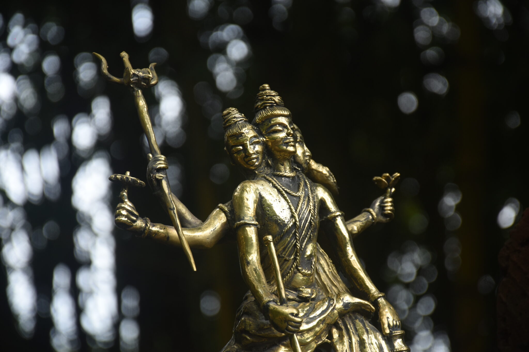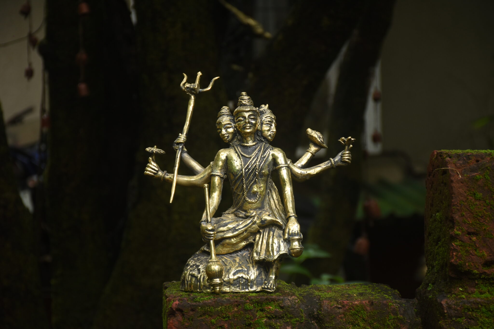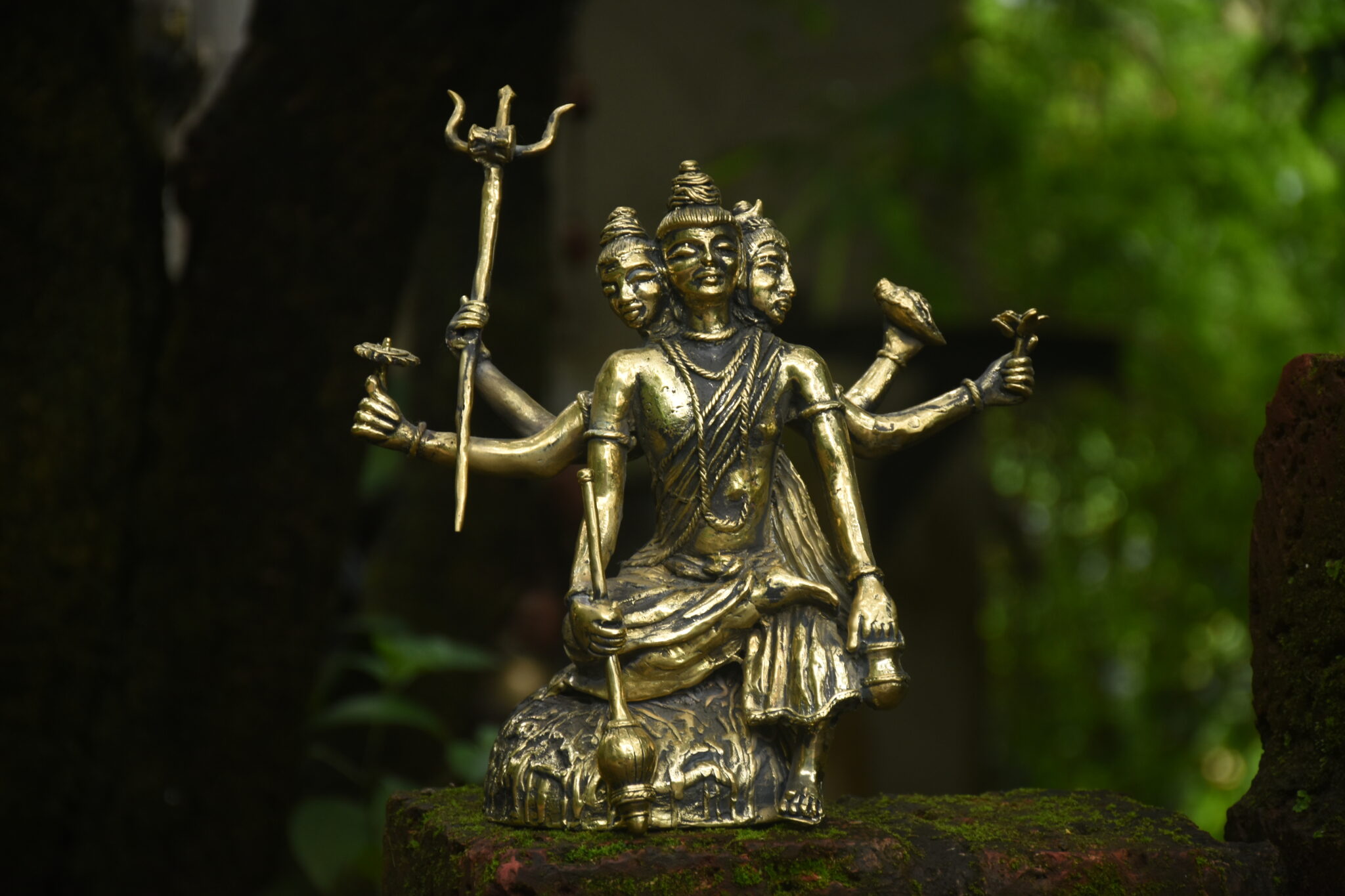 This is brass sculpture of Dattatreya, revered as a combined manifestation of the divine trinity?Brahma (the creator), Vishnu (the preserver), and Shiva (the transformer). The sculpture symbolises his role as the eternal teacher and a guide who finds wisdom in all aspects of existence.