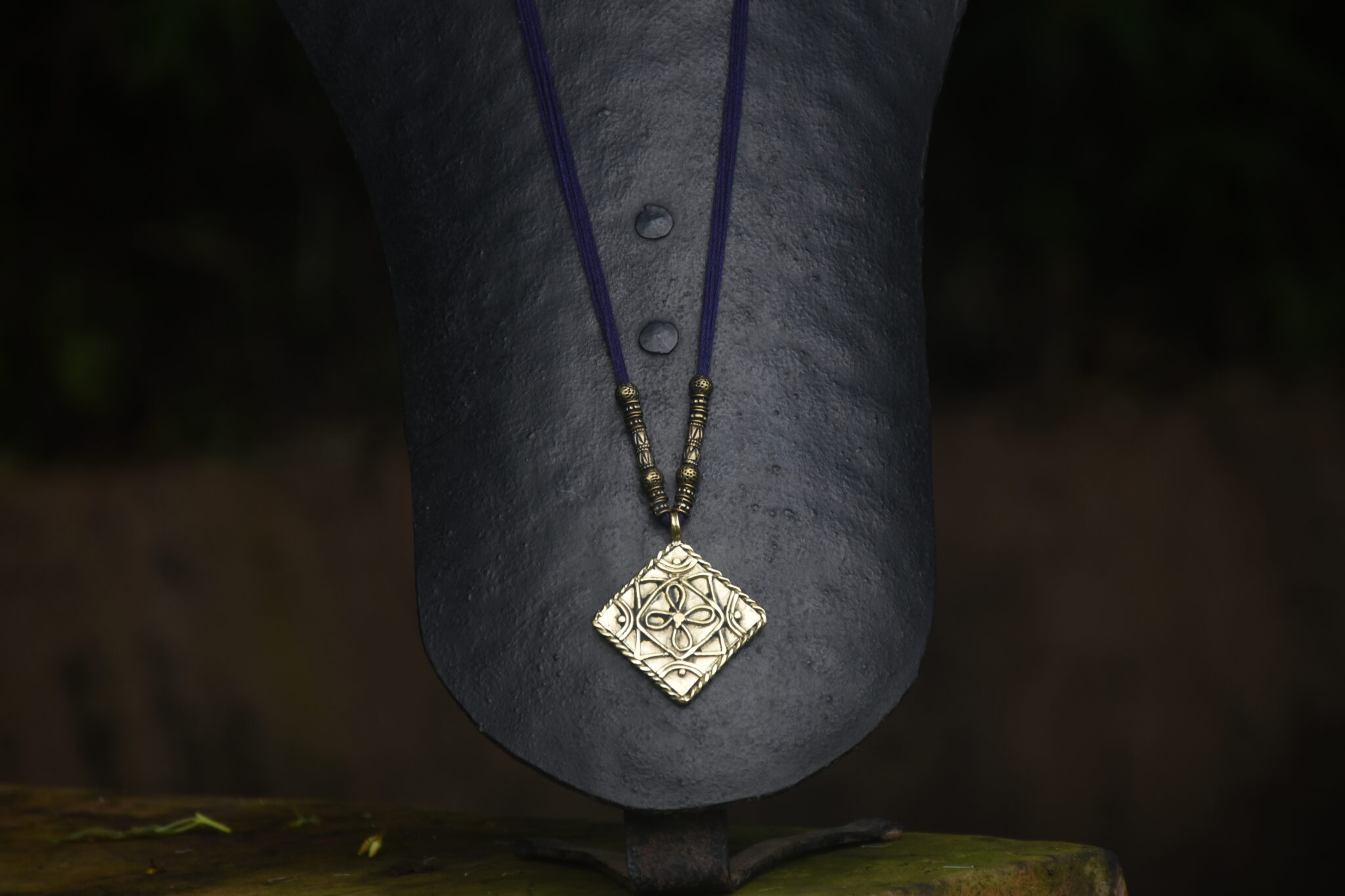 The necklace features a brass pendant made using the traditional Dhokra process, with a geometrical design. This pendant is the threaded and decorated with beads to create a unique piece of wearable art.