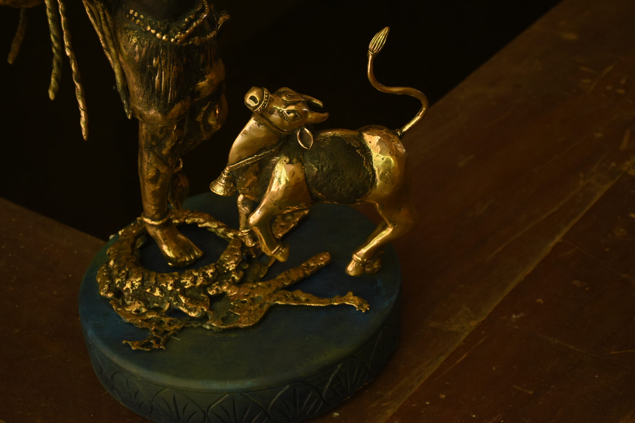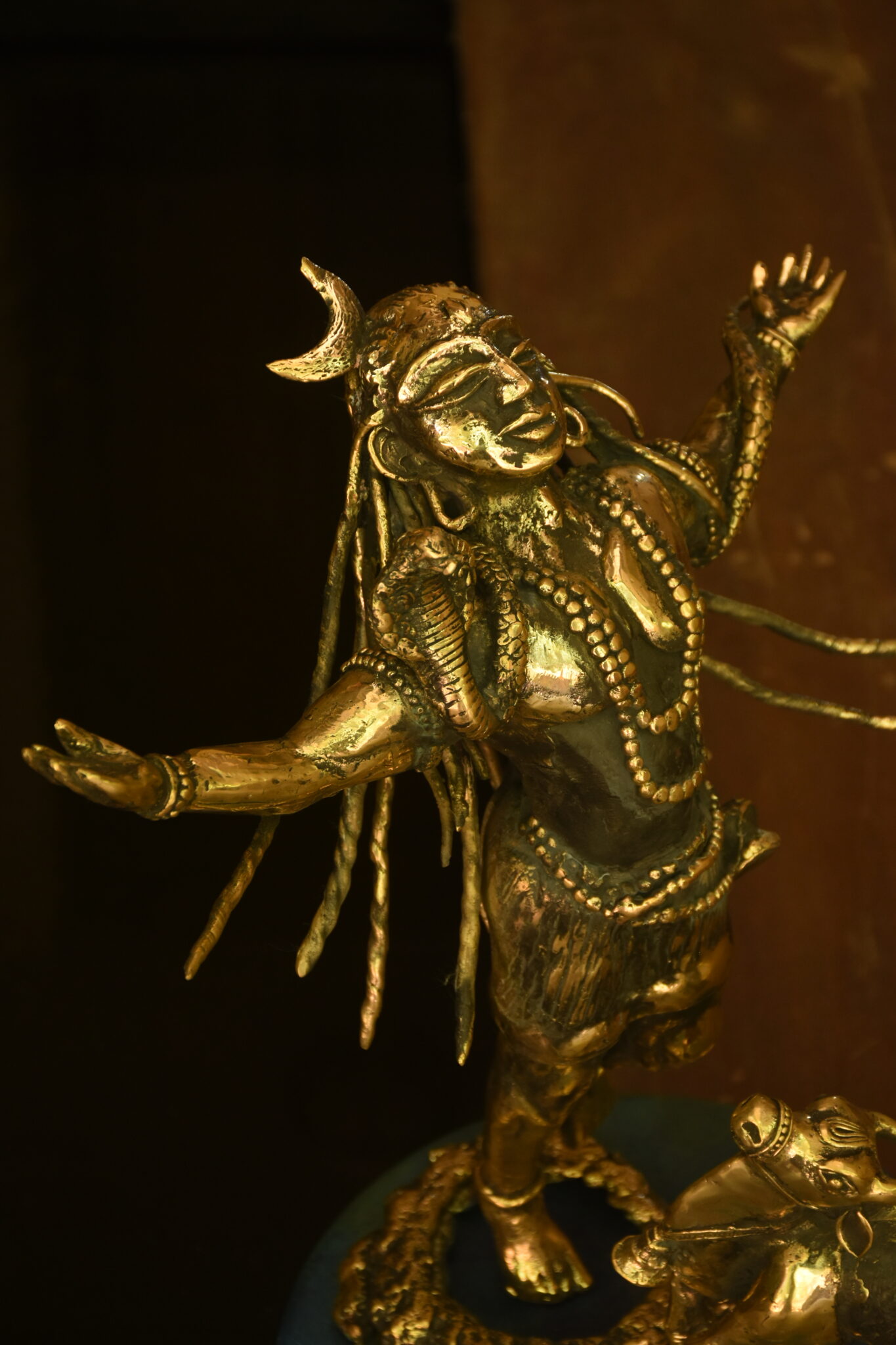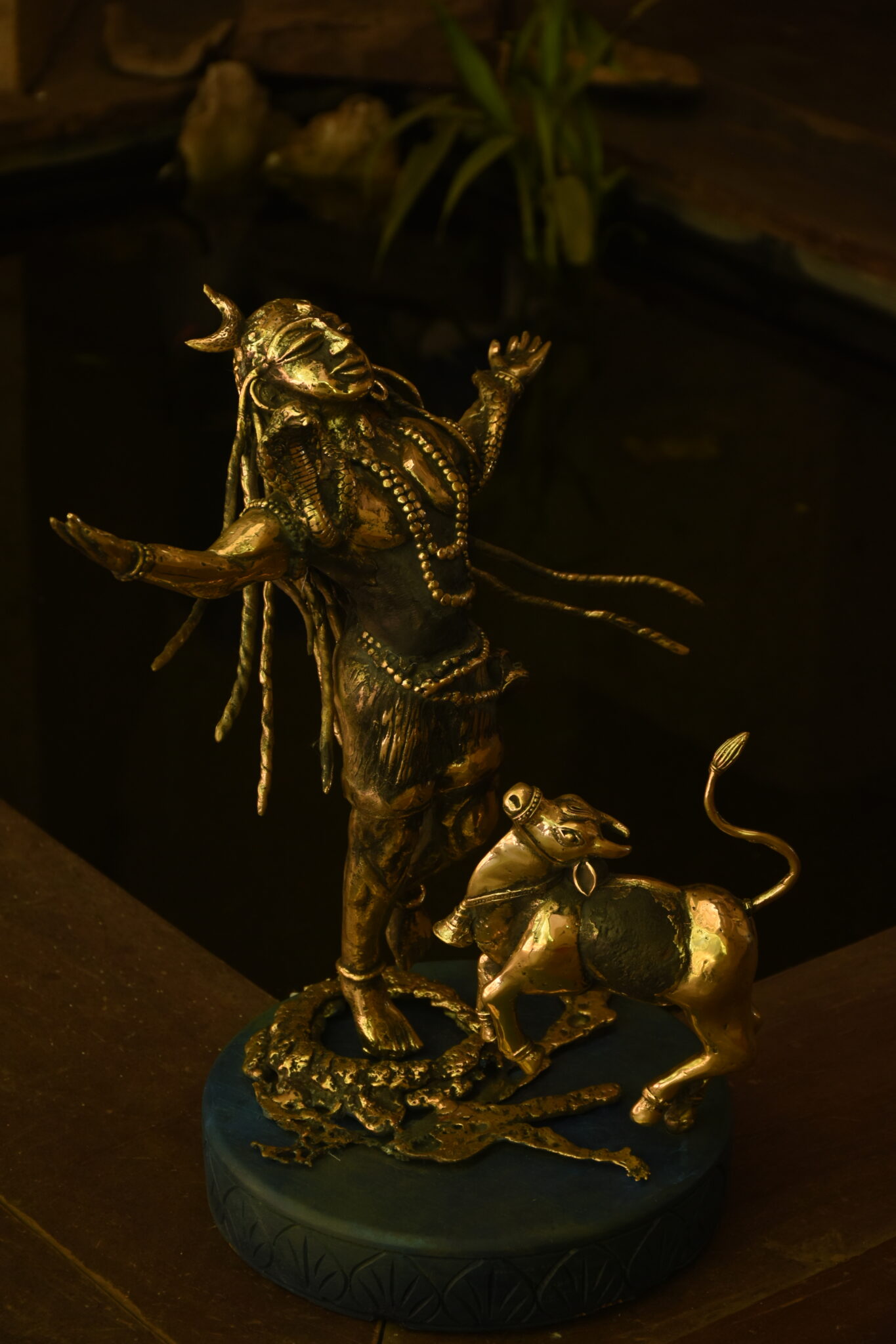 Shiva and Nandi are both made using Rock Dhokra, and they?re standing on a wooden base.