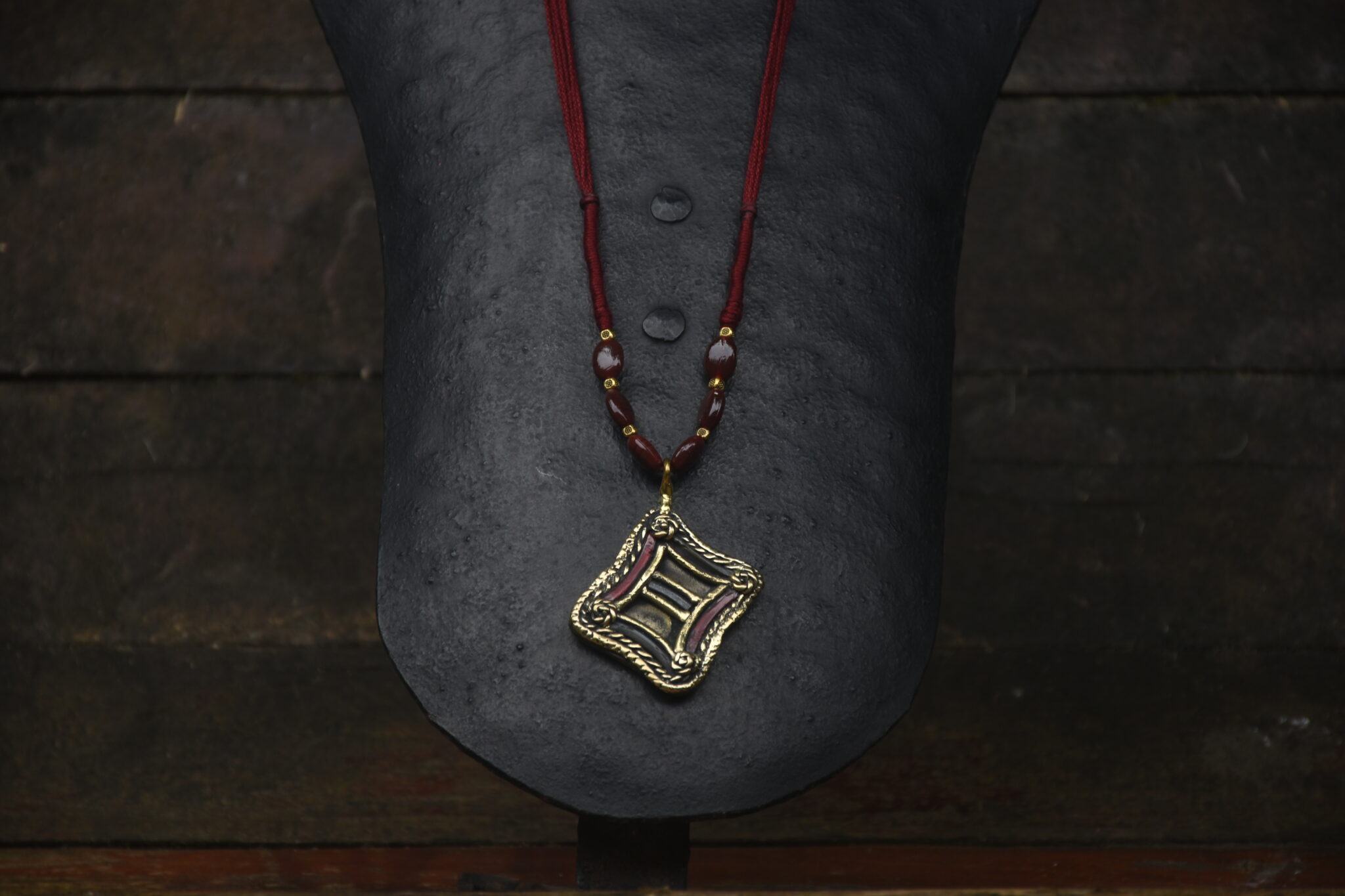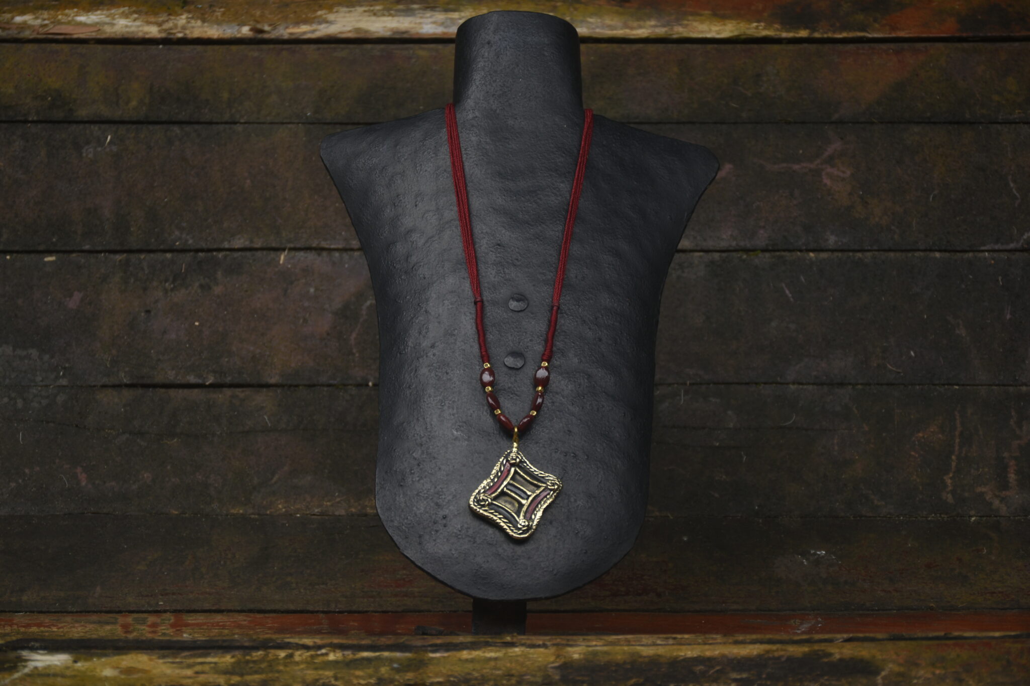 Even the smallest pendant made at Devrai goes through a long journey, and is worked upon at different stages by various members of our team. This is a piece made by fusing glass from a brocken bangle with brass to form a unified whole. After the pendant is made, the threads are added, decorated with a mix of beads or semi-precious stones to complete the piece. The length of the threads is adjustable.