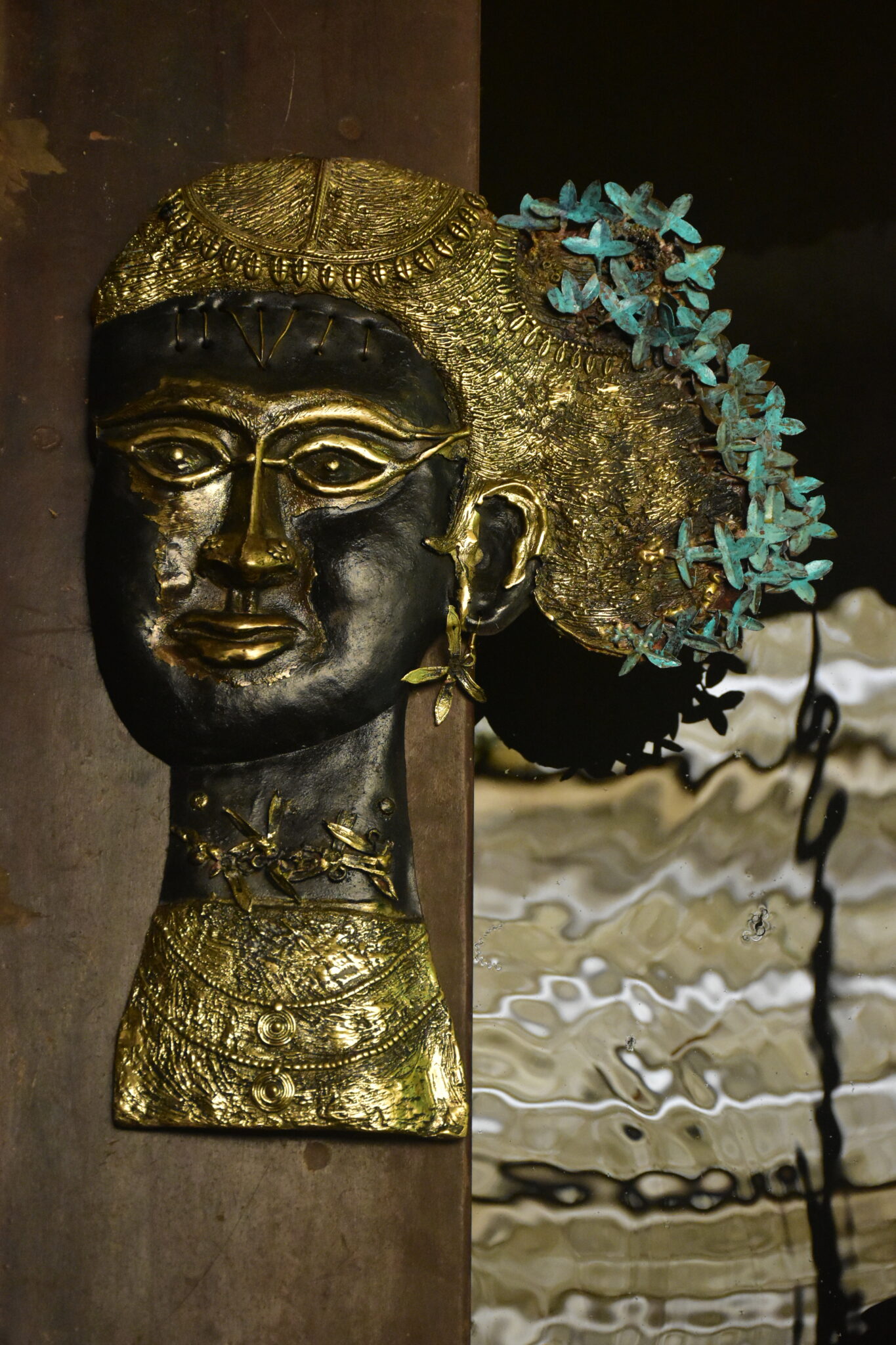 The entire piece is a fusion of iron and brass, combining the Beaten Metal Art and traditional Dhokra process. But the flowers in her hair are copper, with a fresh teal achieved through patination.