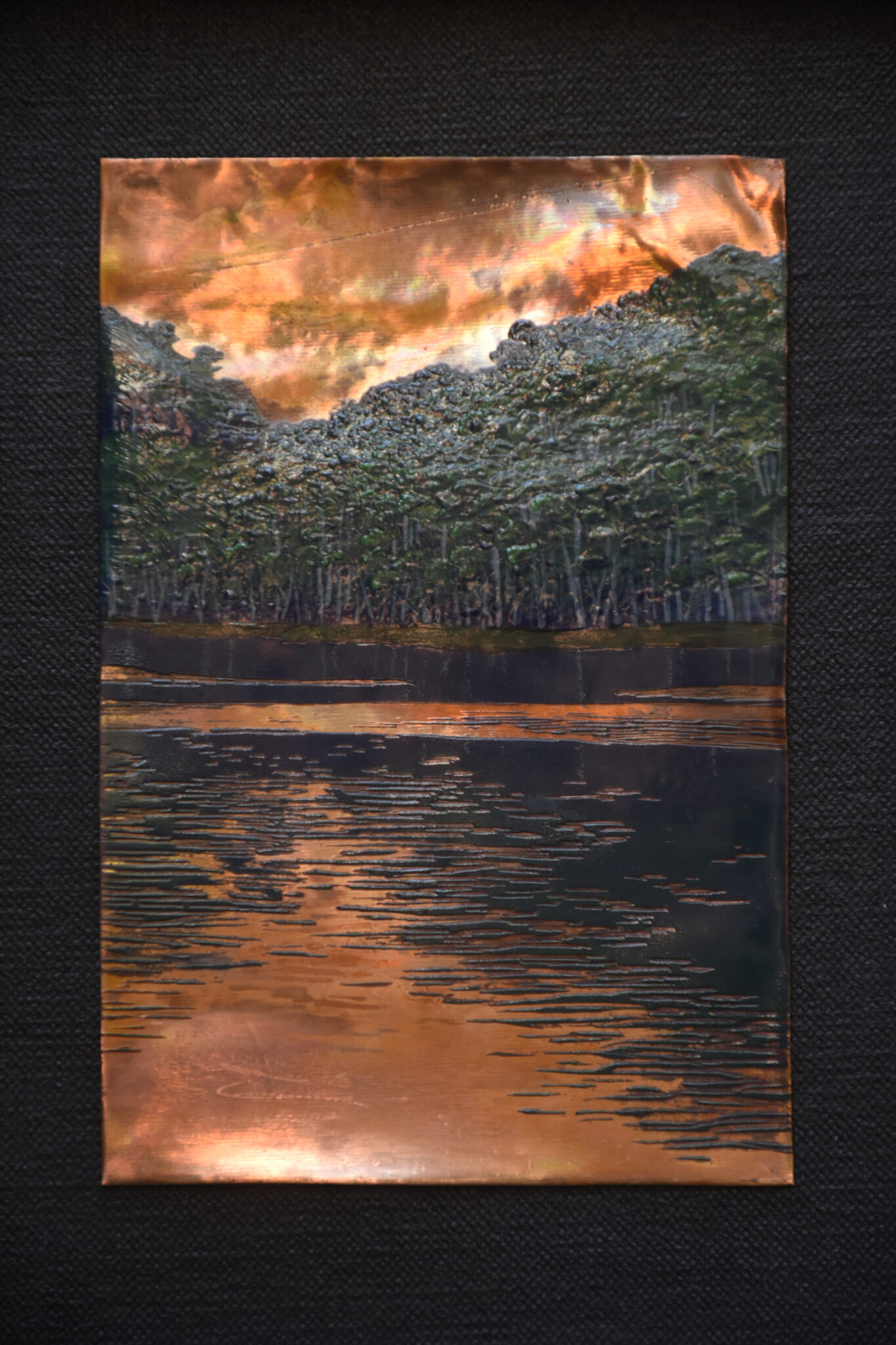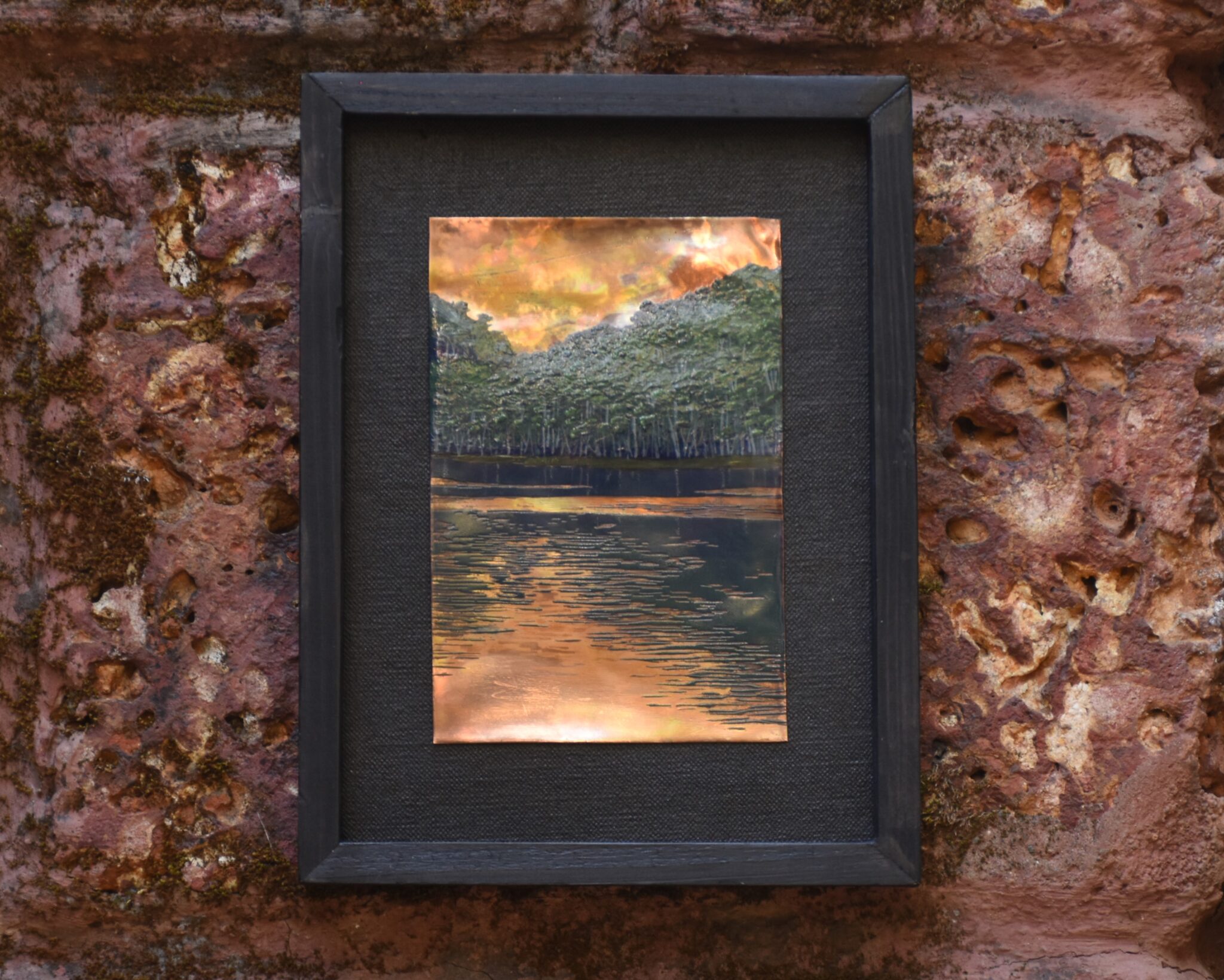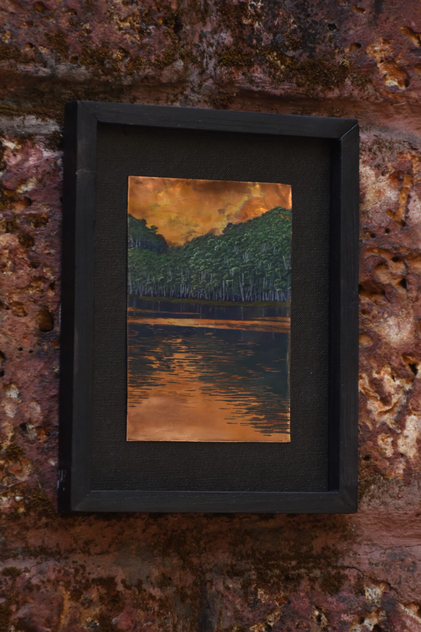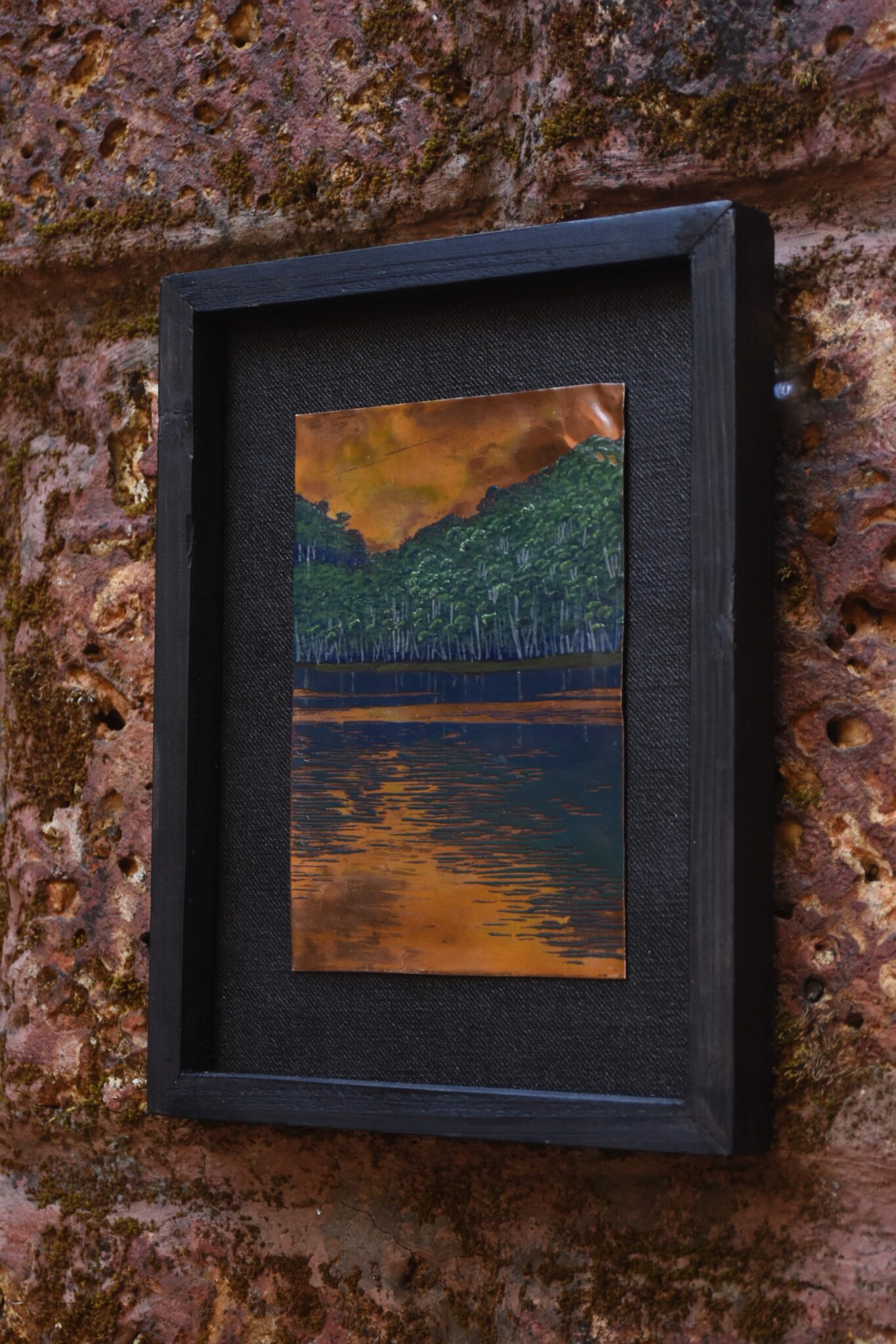 Inspired by the lush forests of Munnar, this enamel painting captures the quiet beauty of the mist-laden landscapes. What sets the piece apart is its thoughtful use of exposed copper. This interplay between enamel and raw metal creates a tactile richness, making the painting both visually striking and materially unique?an elegant ode to landscape and craft.