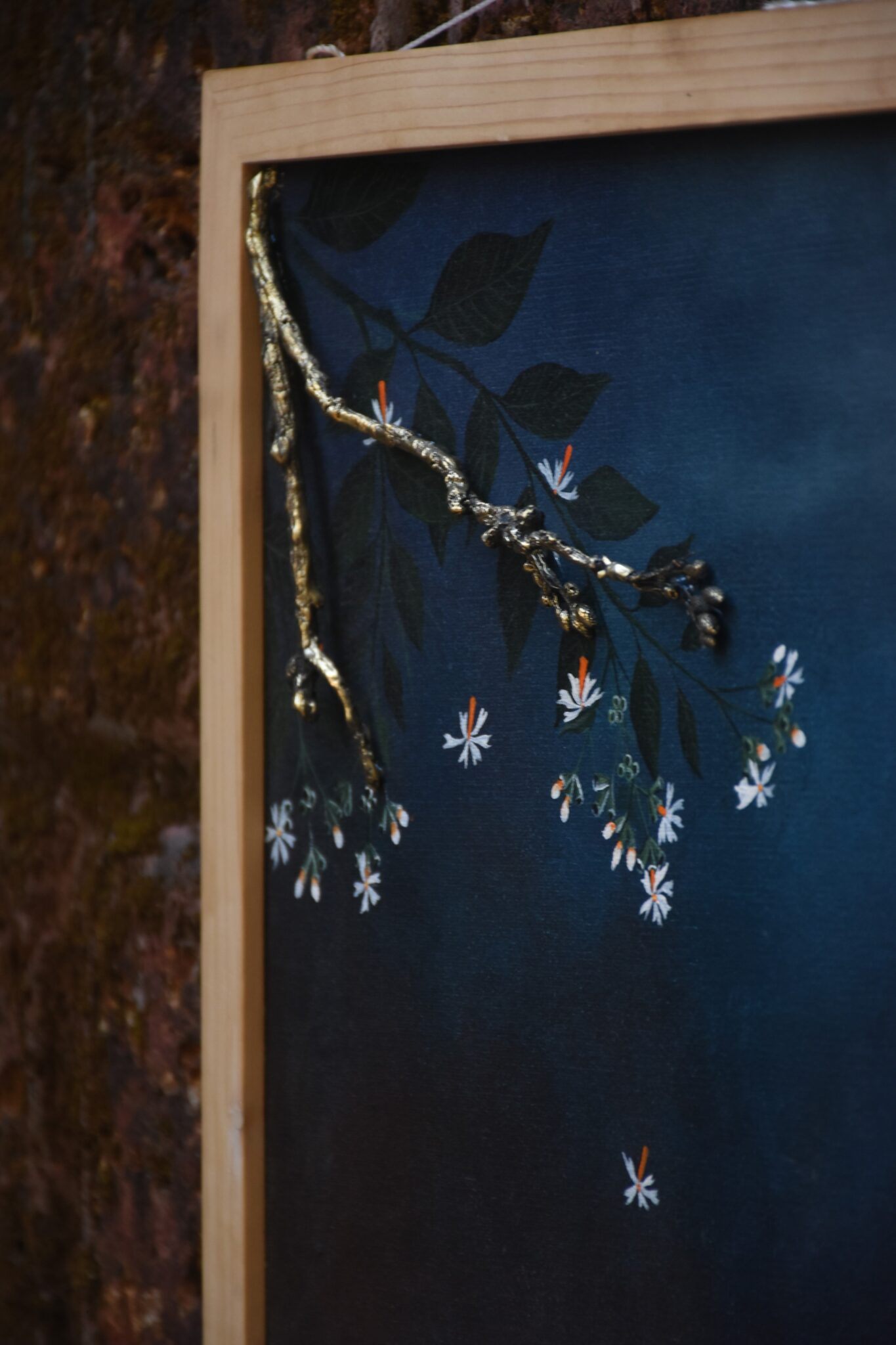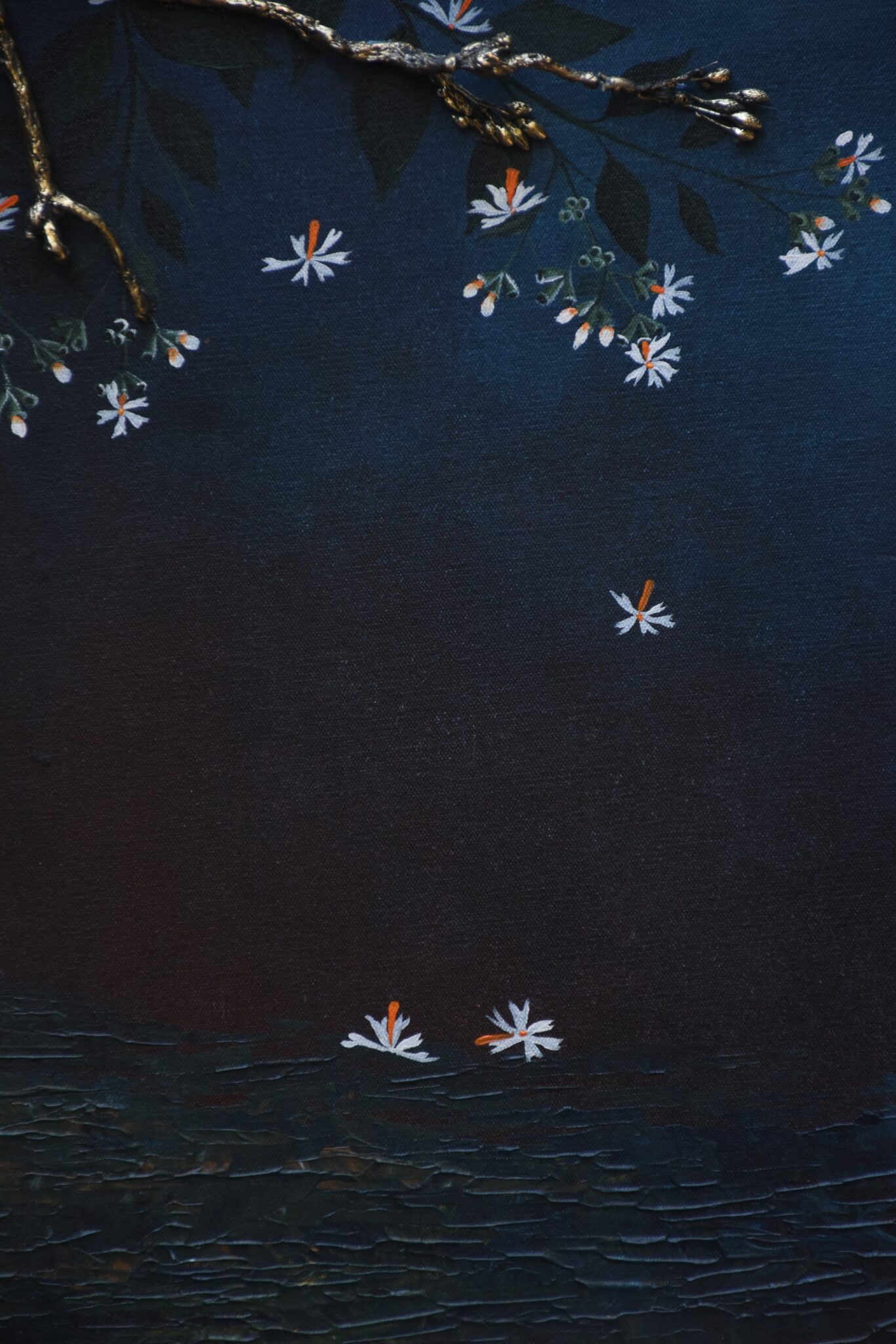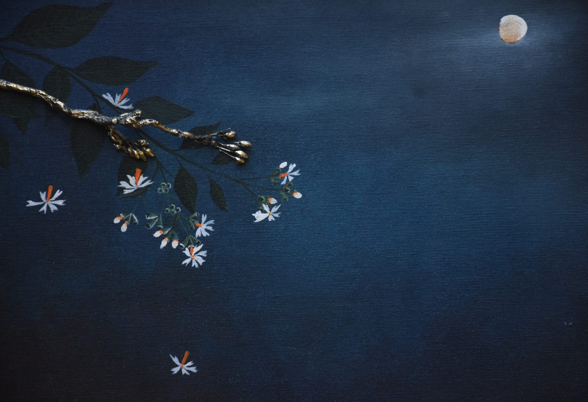 This painting evokes that fragrant night with the parijat flowers light by the full moon light, when the sun has just set but the last red glow remains..