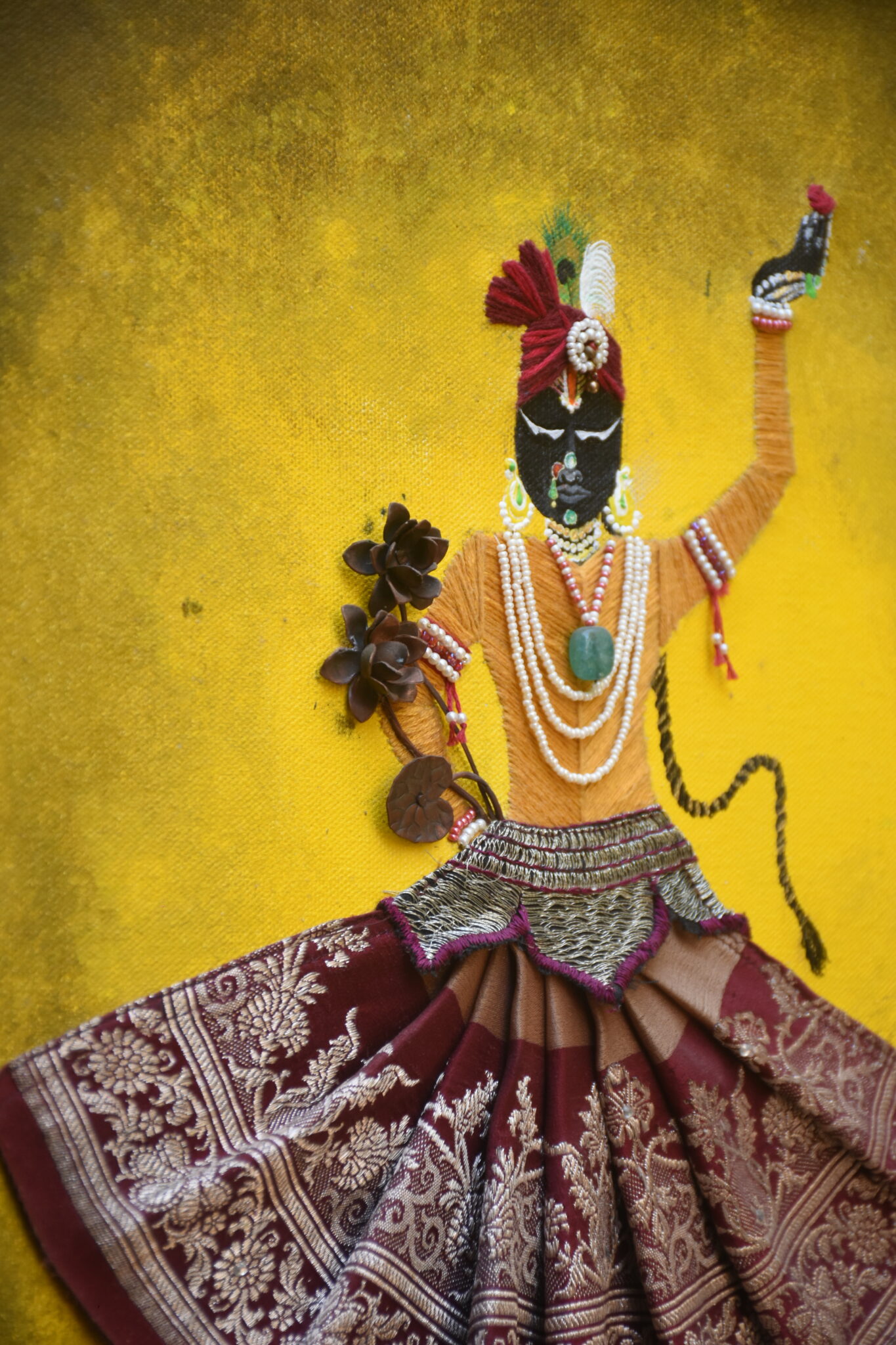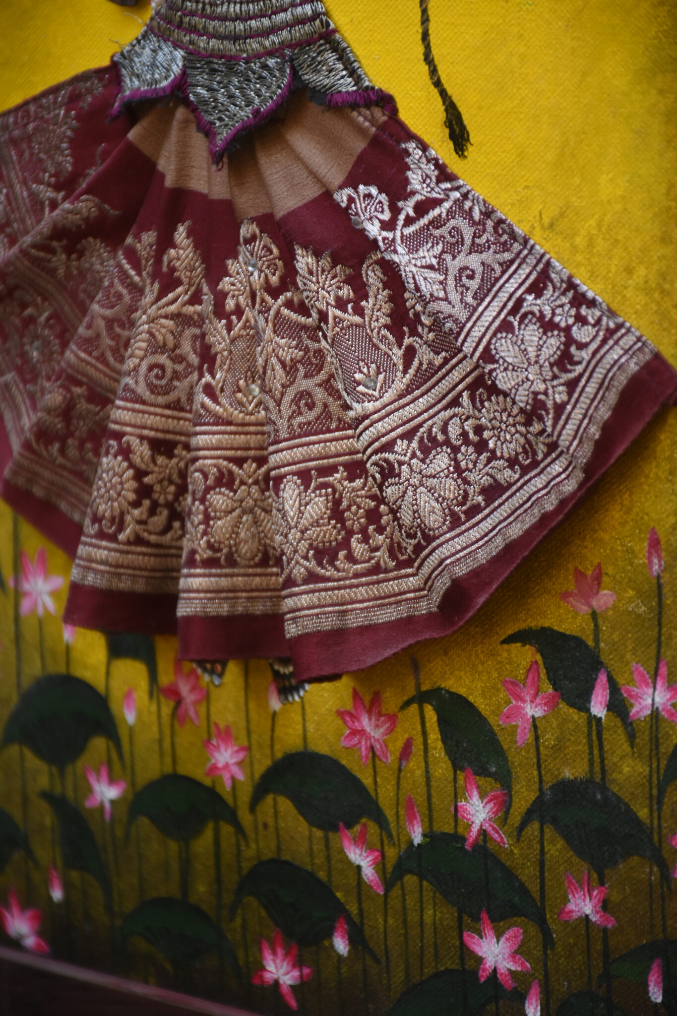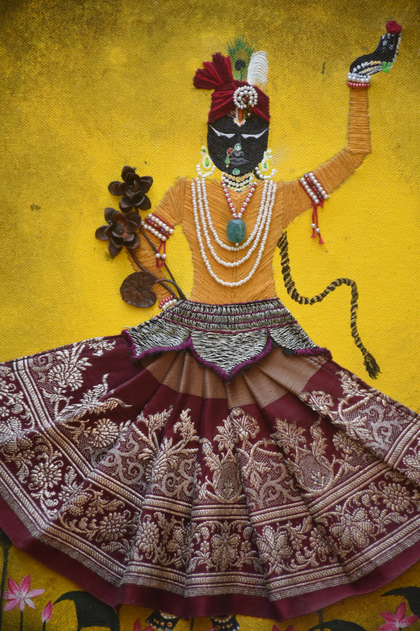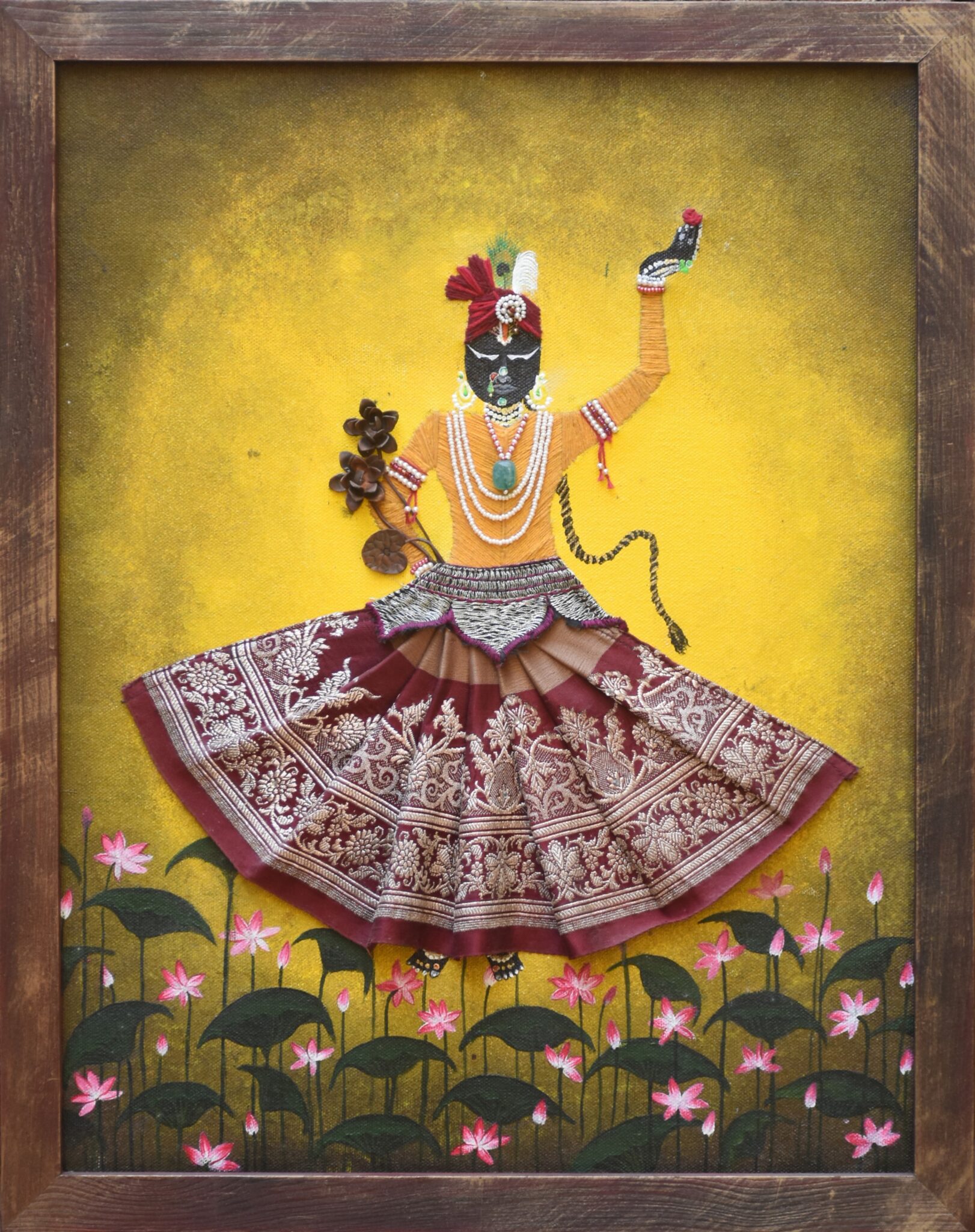 This beautiful wall piece blends textile art with metal. This icon is inspired from the Shrinathji in Nathadwara, who is given a different ‘Shringar’/ costume everyday giving all artists an opportunity to create. In this piece, the clothes are made in textile art, and the jewellery is intricately added by hand using beads and stones. The lotus flowers, bud and leaf are handmade using a copper sheet.