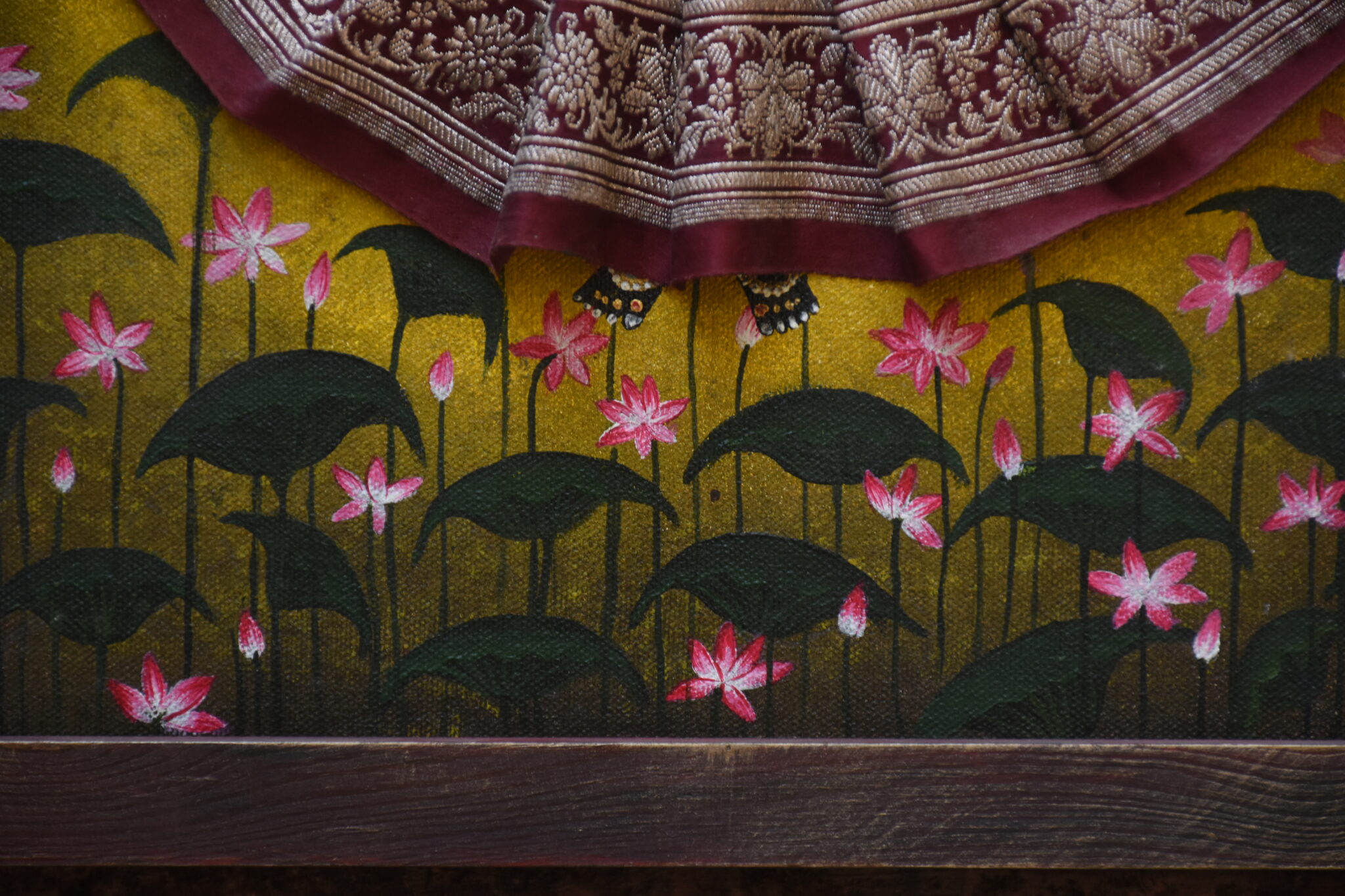 Materials: Acrylic Paint on Canvas, Textiles, Brass, Copper Flowers, Wooden Frame