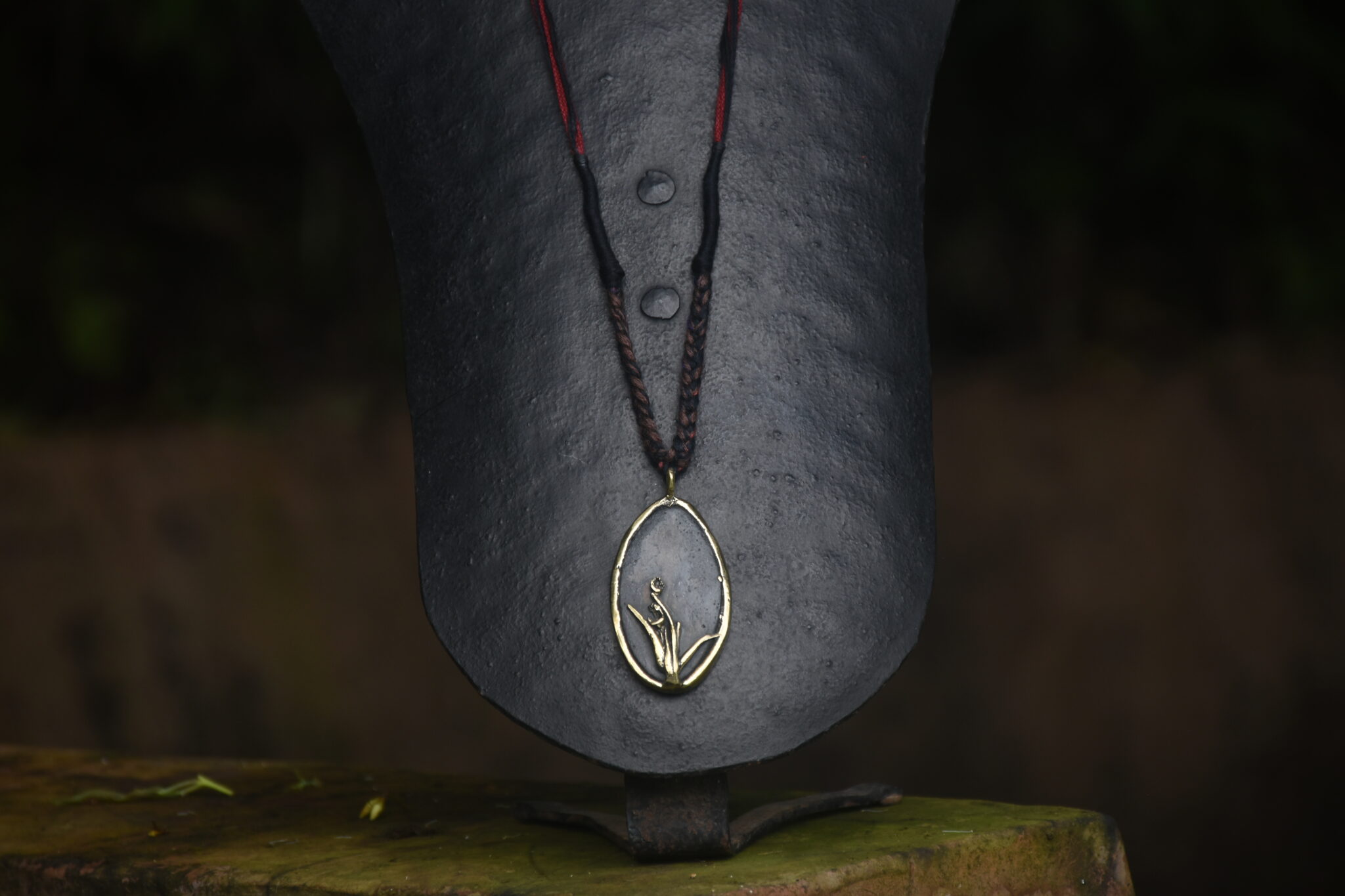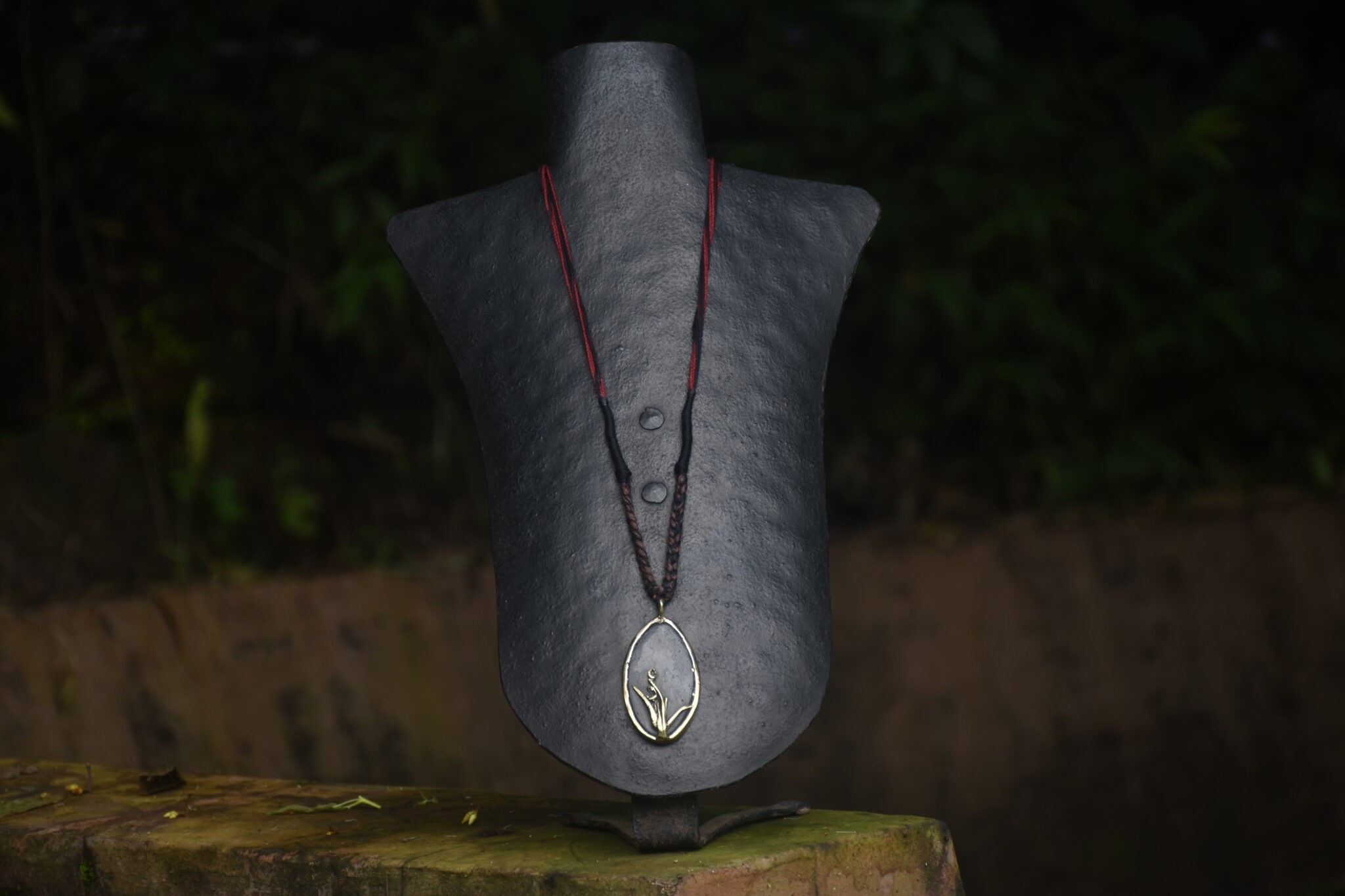 Even the smallest pendant made at Devrai goes through a long journey, and is worked upon at different stages by various members of our team. This is a piece from our terracotta and brass collection, in which the two materials are seamlessly fused in a unified whole. After the pendant is made, the threads are added, decorated with a mix of beads or semi-precious stones to complete the piece. The length of the threads is adjustable.