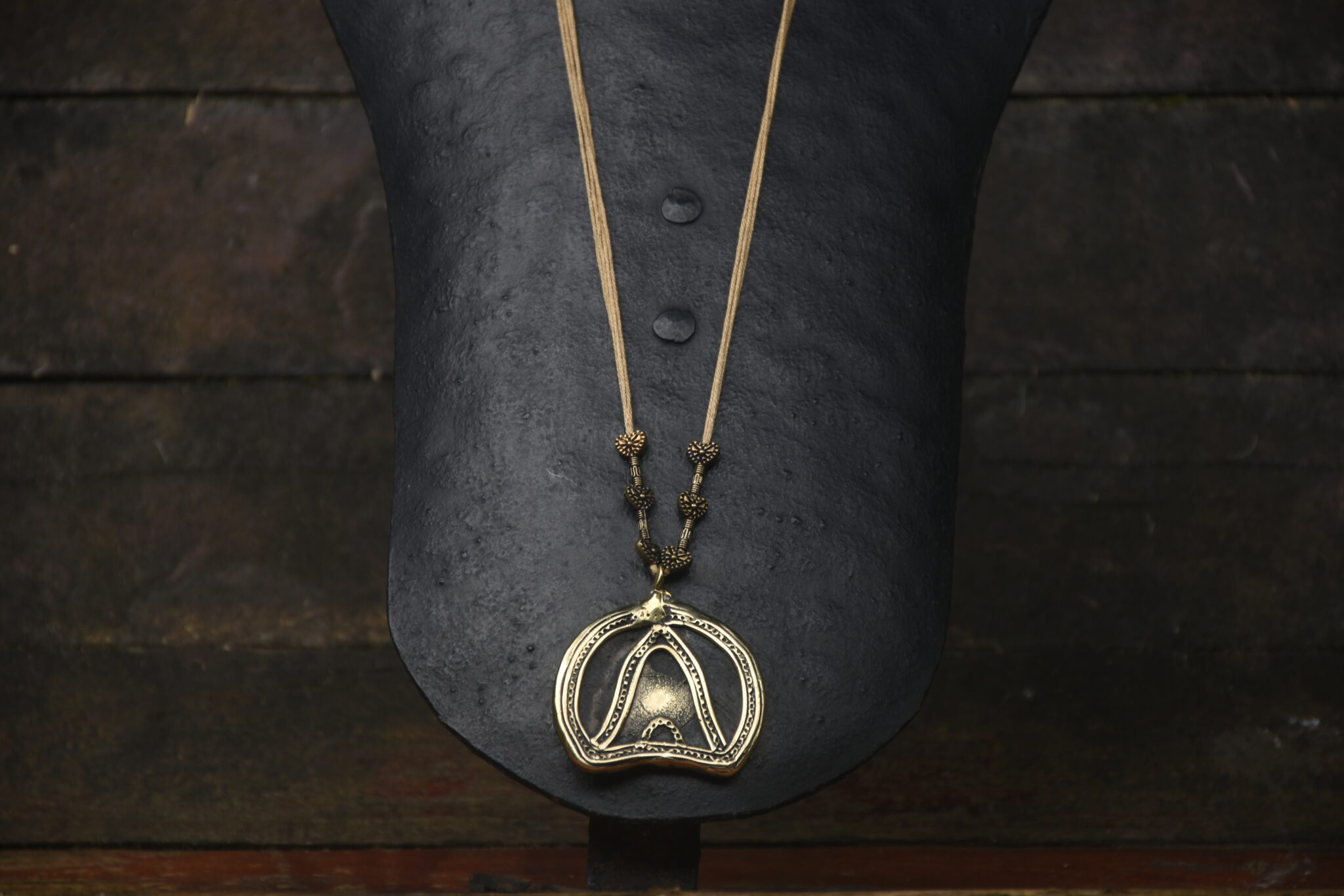 Even the smallest pendant made at Devrai goes through a long journey, and is worked upon at different stages by various members of our team. This is a piece from our terracotta and brass collection, in which the two materials are seamlessly fused in a unified whole. After the pendant is made, the threads are added, decorated with a mix of beads or semi-precious stones to complete the piece. The length of the threads is adjustable.
