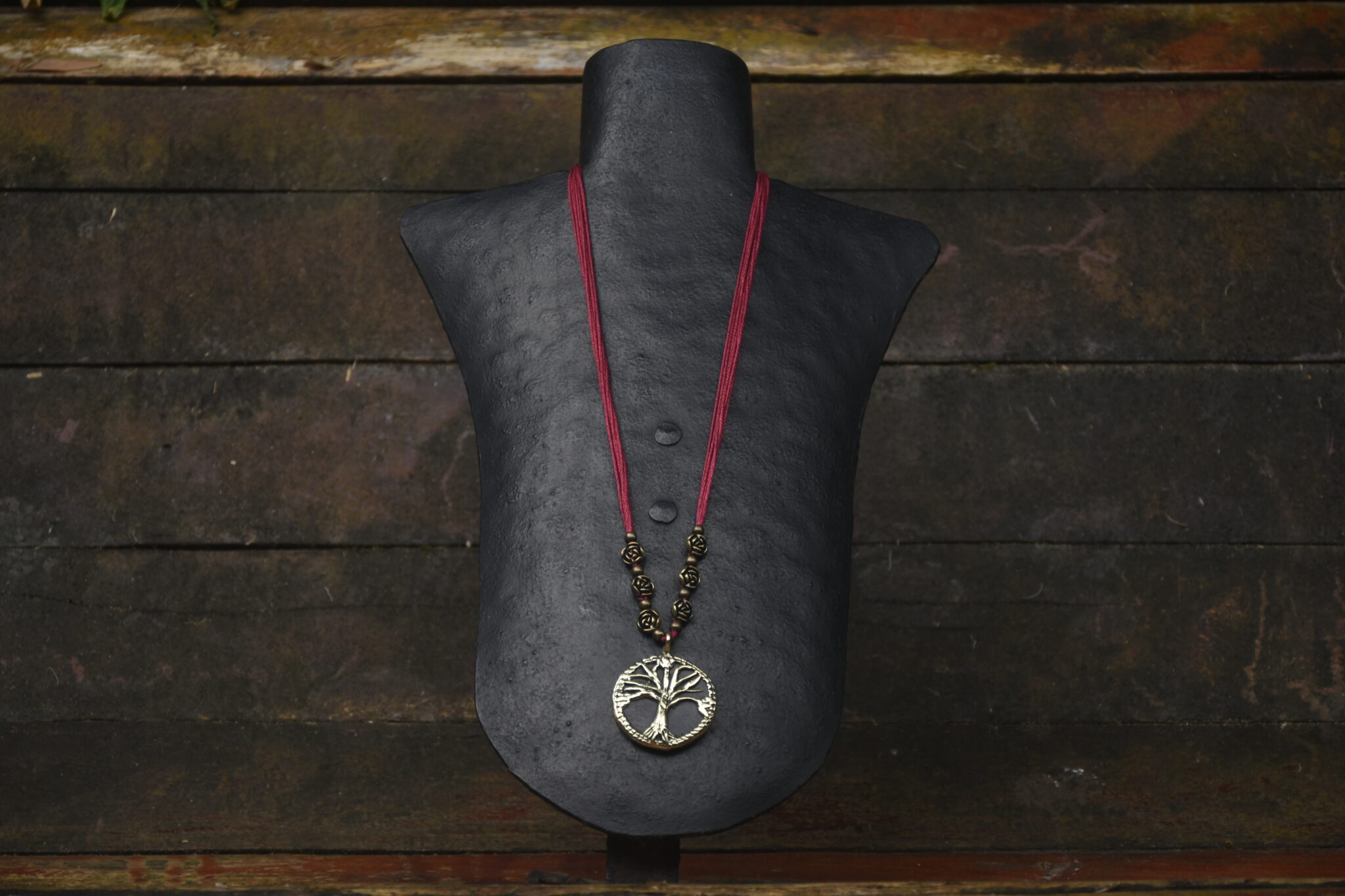 Even the smallest pendant made at Devrai goes through a long journey, and is worked upon at different stages by various members of our team. This is a piece from our terracotta and brass collection, in which the two materials are seamlessly fused in a unified whole. After the pendant is made, the threads are added, decorated with a mix of beads or semi-precious stones to complete the piece. The length of the threads is adjustable.