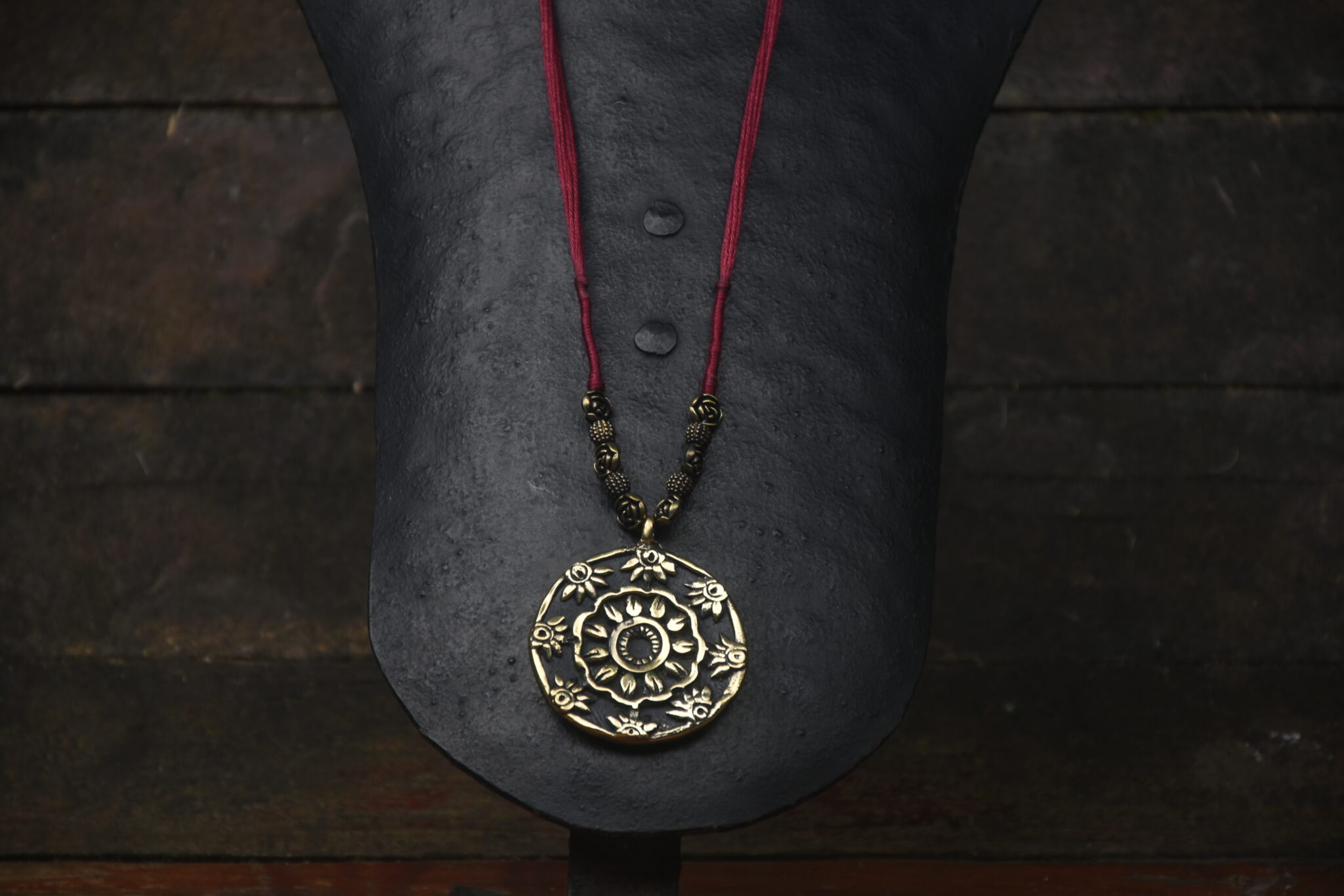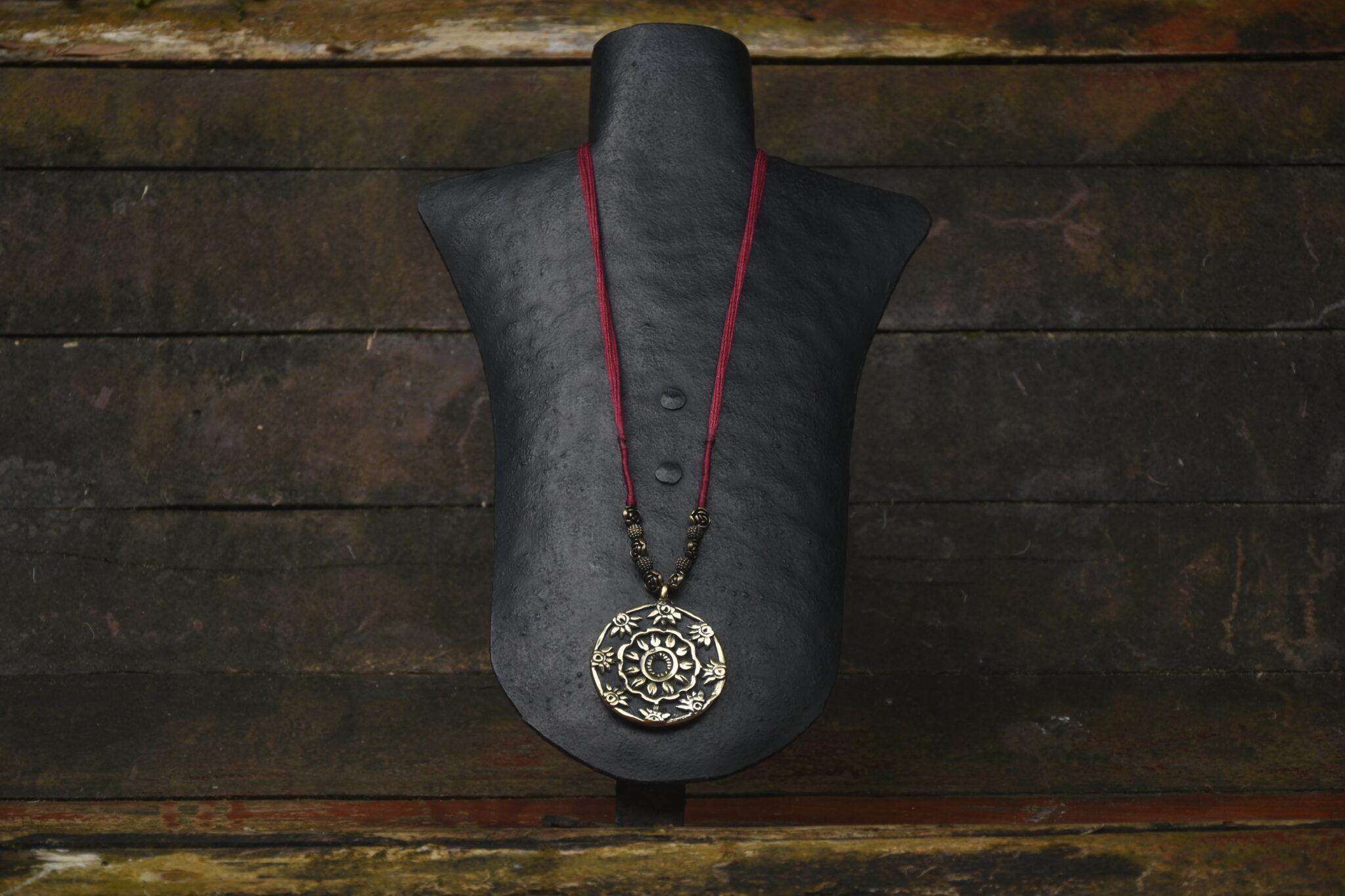 Even the smallest pendant made at Devrai goes through a long journey, and is worked upon at different stages by various members of our team. This is a piece from our terracotta and brass collection, in which the two materials are seamlessly fused in a unified whole. After the pendant is made, the threads are added, decorated with a mix of beads or semi-precious stones to complete the piece. The length of the threads is adjustable.