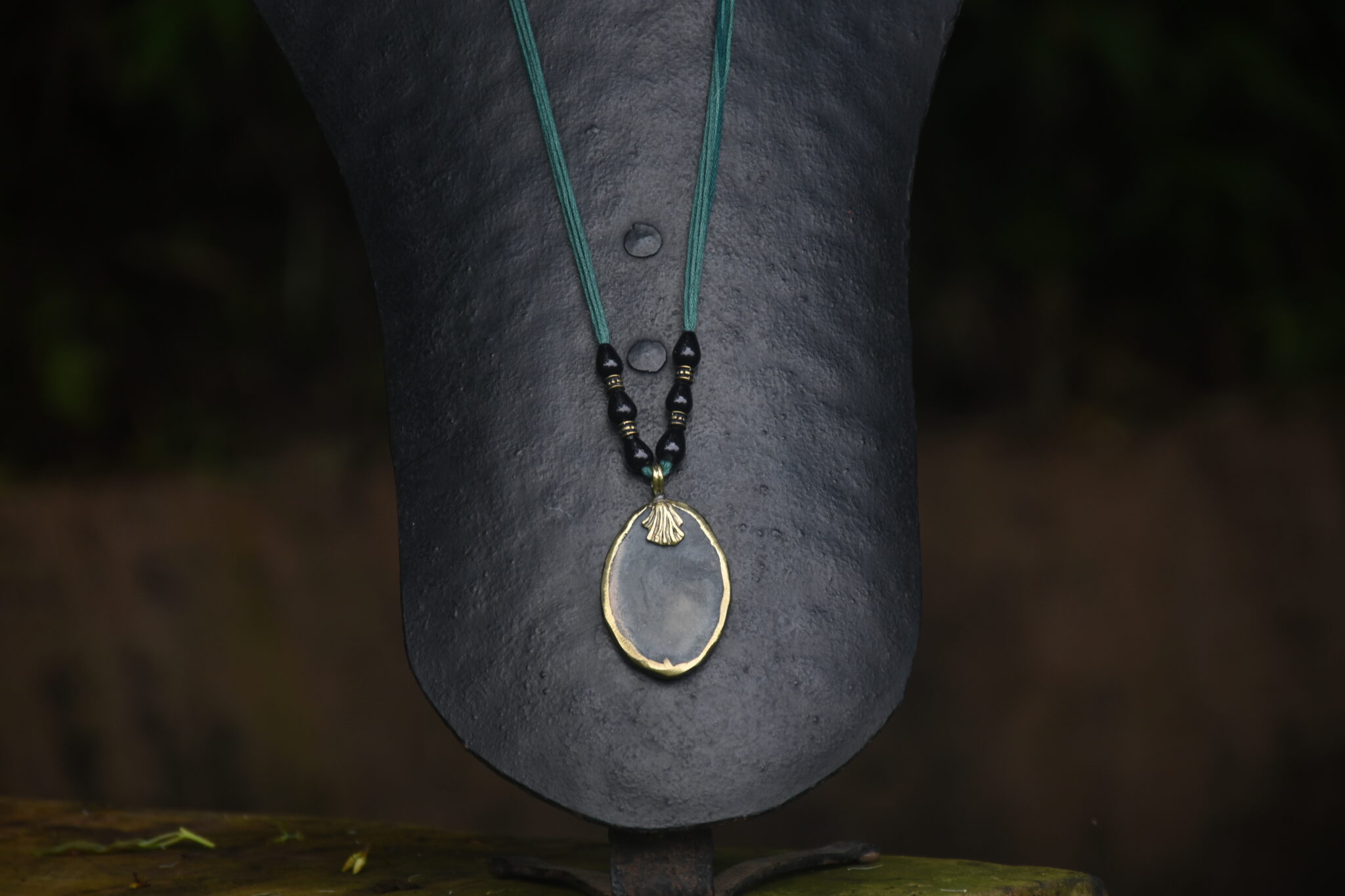 Even the smallest pendant made at Devrai goes through a long journey, and is worked upon at different stages by various members of our team. This is a piece from our terracotta and brass collection, in which the two materials are seamlessly fused in a unified whole. After the pendant is made, the threads are added, decorated with a mix of beads or semi-precious stones to complete the piece. The length of the threads is adjustable.