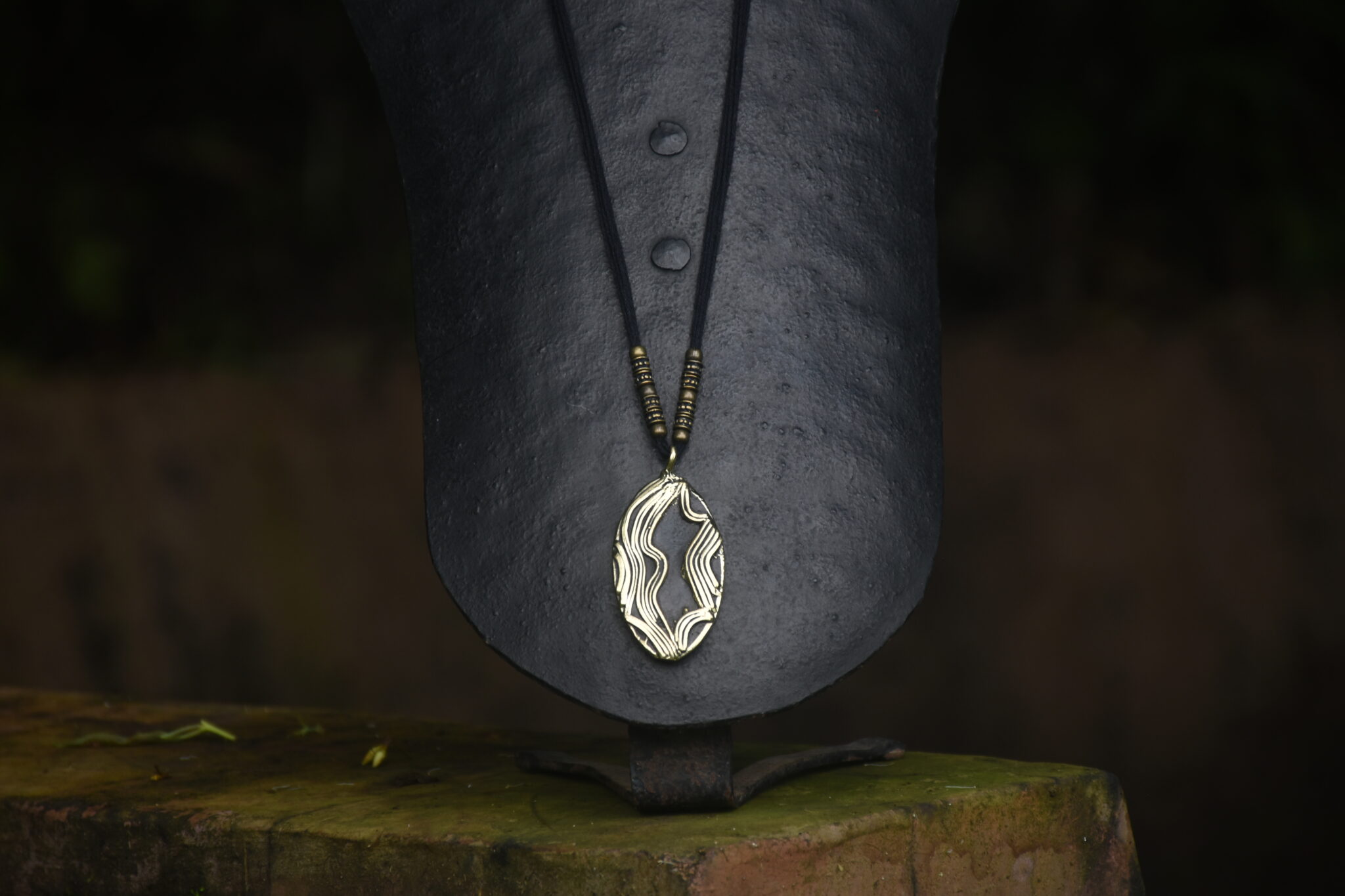 Even the smallest pendant made at Devrai goes through a long journey, and is worked upon at different stages by various members of our team. This is a piece from our terracotta and brass collection, in which the two materials are seamlessly fused in a unified whole. After the pendant is made, the threads are added, decorated with a mix of beads or semi-precious stones to complete the piece. The length of the threads is adjustable.