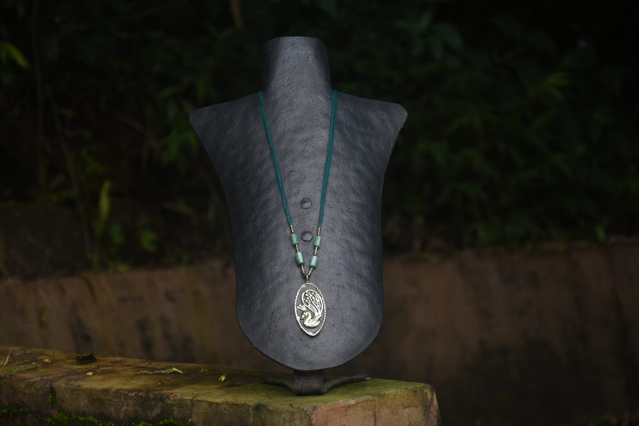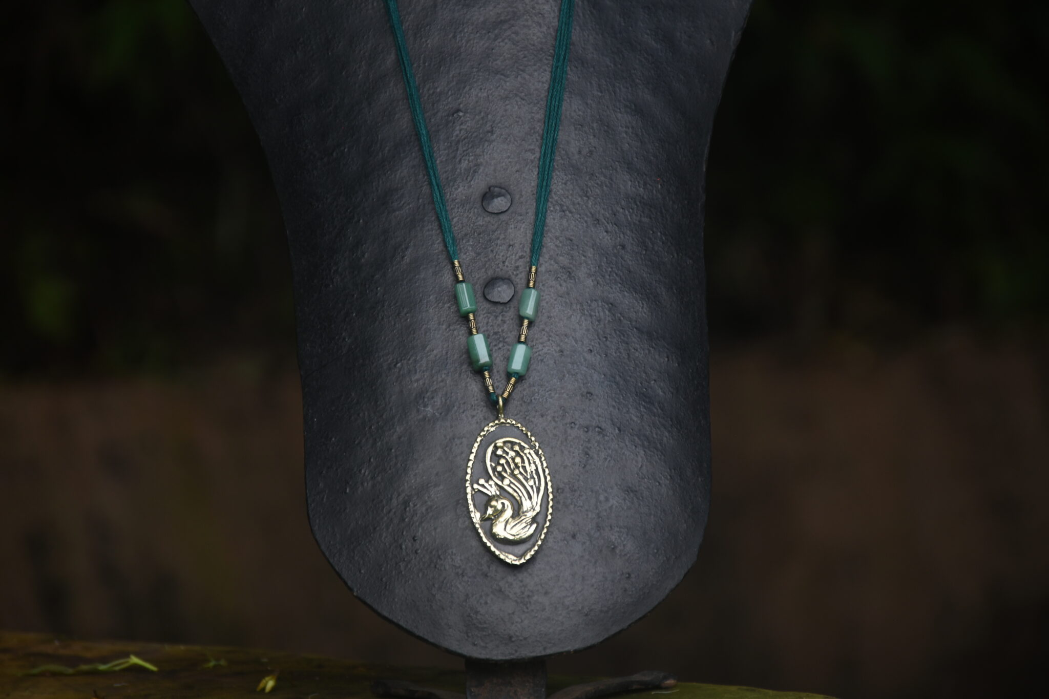 Even the smallest pendant made at Devrai goes through a long journey, and is worked upon at different stages by various members of our team. This is a piece from our terracotta and brass collection, in which the two materials are seamlessly fused in a unified whole. After the pendant is made, the threads are added, decorated with a mix of beads or semi-precious stones to complete the piece. The length of the threads is adjustable.